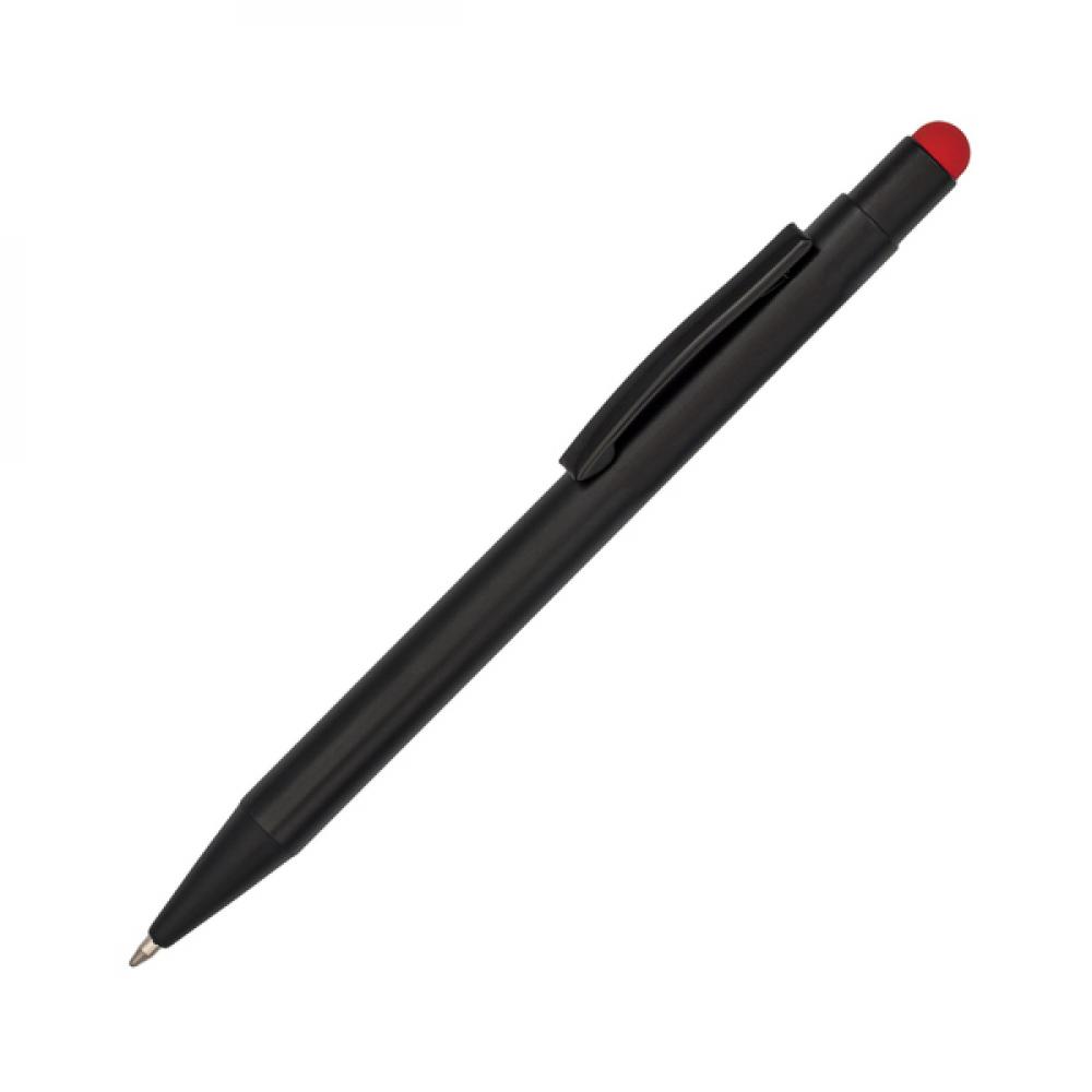 Шариковая ручка с черным корпусом и цветным наконечником для сенсорных экранов. Возможность нанесения блестящего логотипа цвета, соответствующего цвету стилуса для сенсорных экранов. Синий стержень.