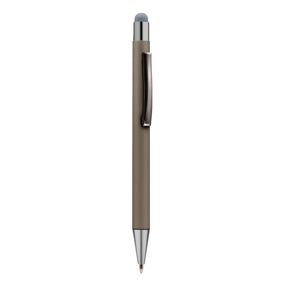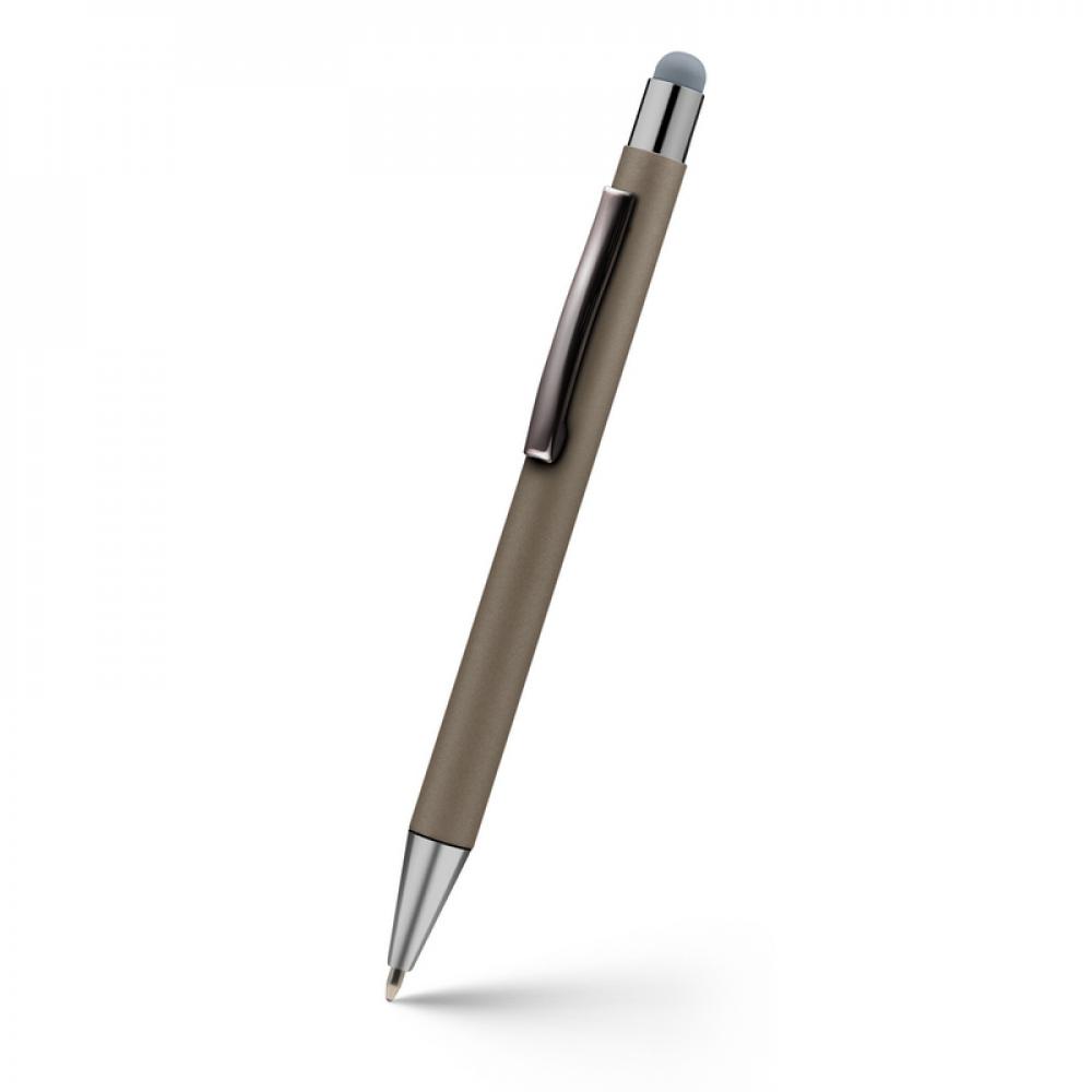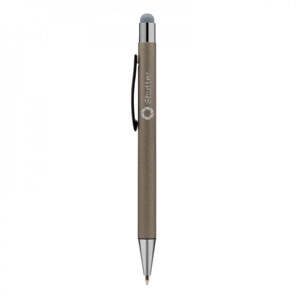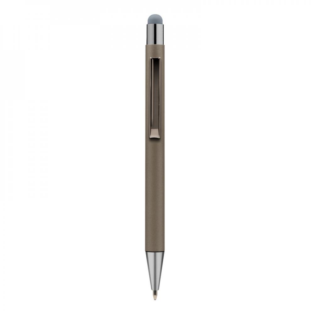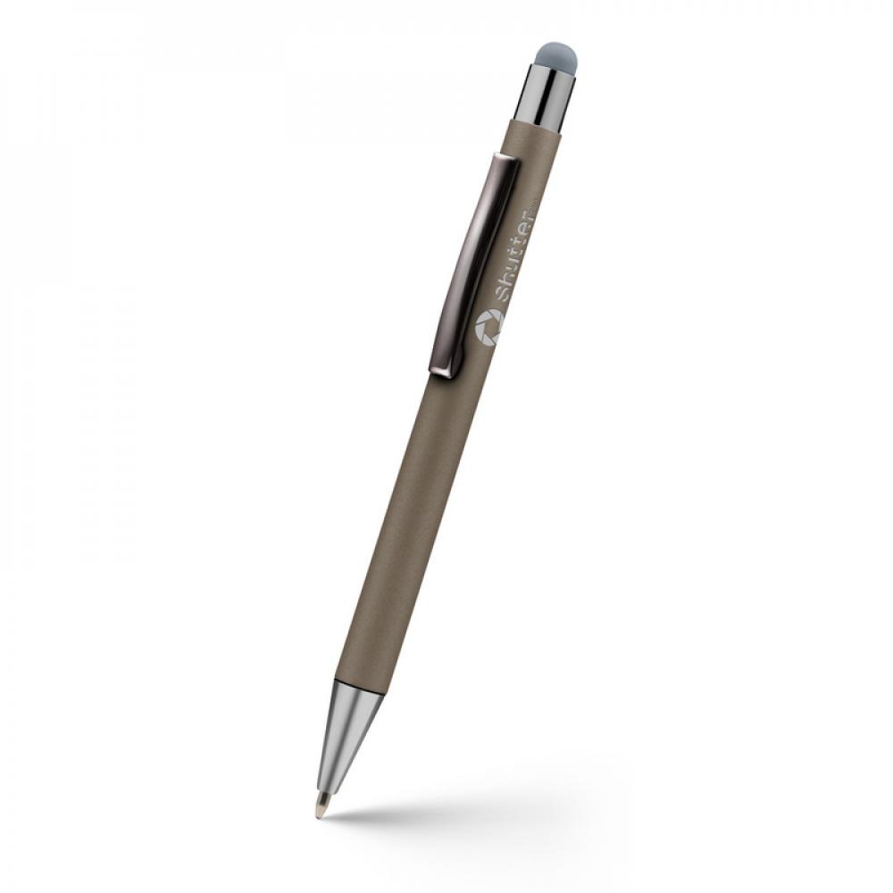 Шариковая ручка, сенсорный стилус с цветным корпусом и блестящими деталями отделки.