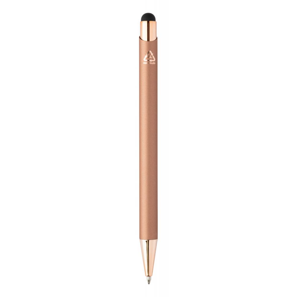Шариковая ручка и стилус из переработленного алюминия с резиновым покрытием и деталями из розового золота. Специальное покрытие для зеркальной лазерной гравировки в цвете розового золота. С синим заправочным стержнем.