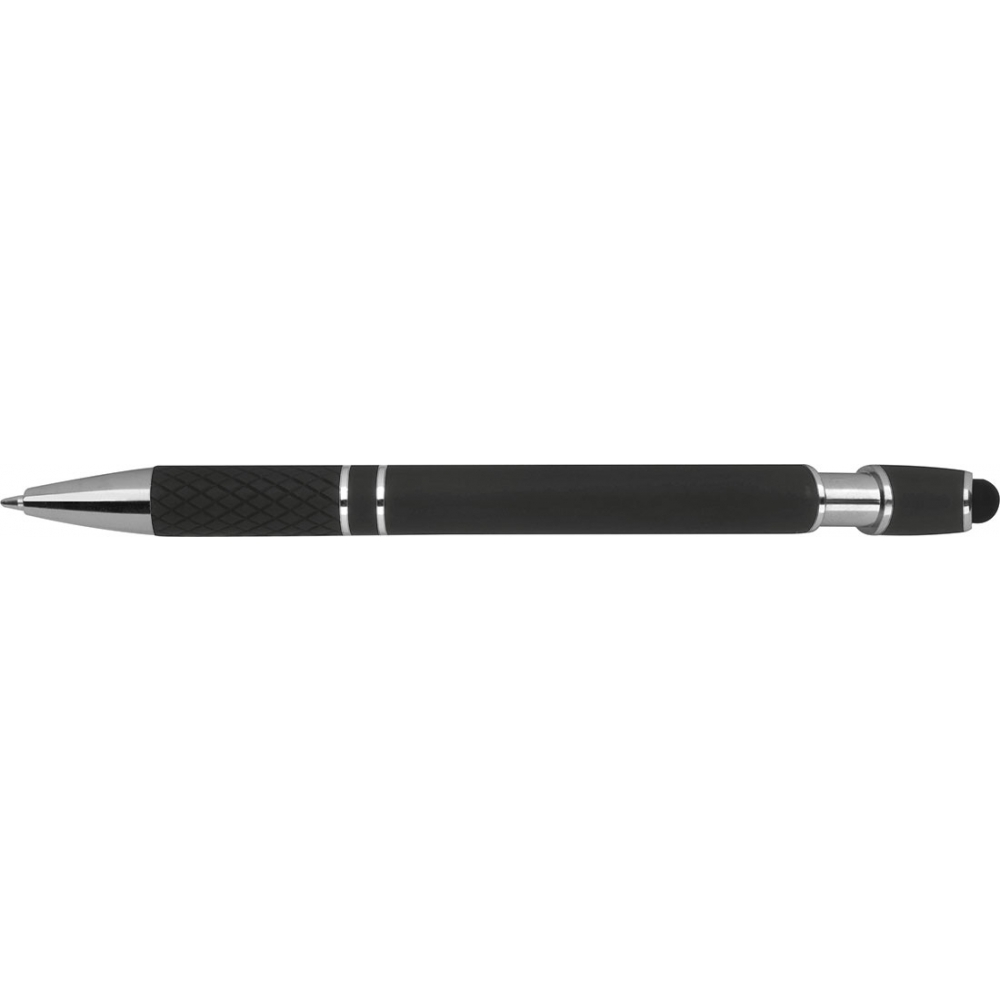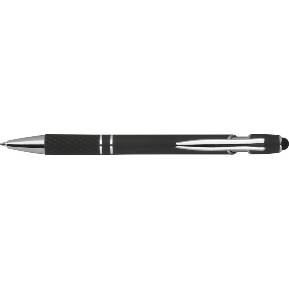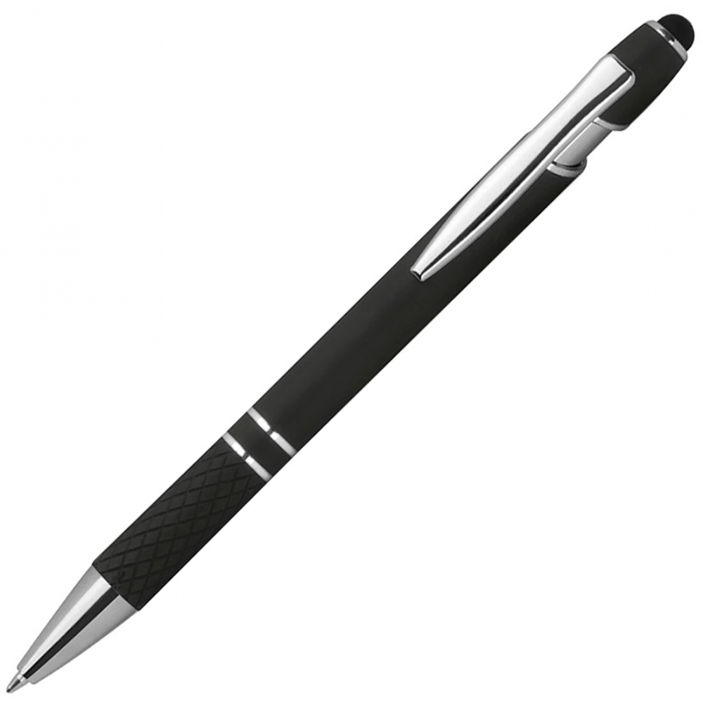Пластиковая ручка с серебристыми элементами, синие чернила, наконечник стилуса для работы с сенсорным экраном и прорезиненная зона захвата.