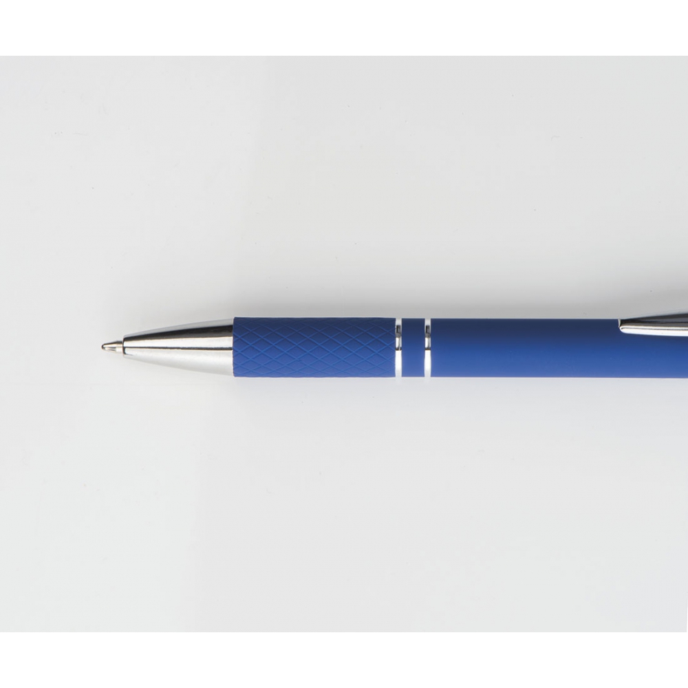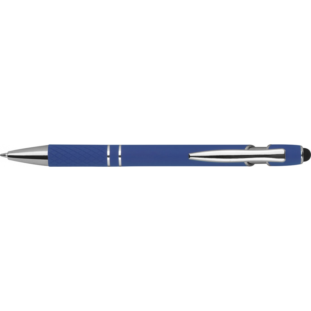 Пластиковая ручка с серебристыми элементами, синие чернила, наконечник стилуса для работы с сенсорным экраном и прорезиненная зона захвата.