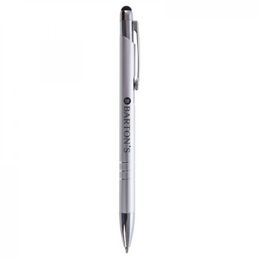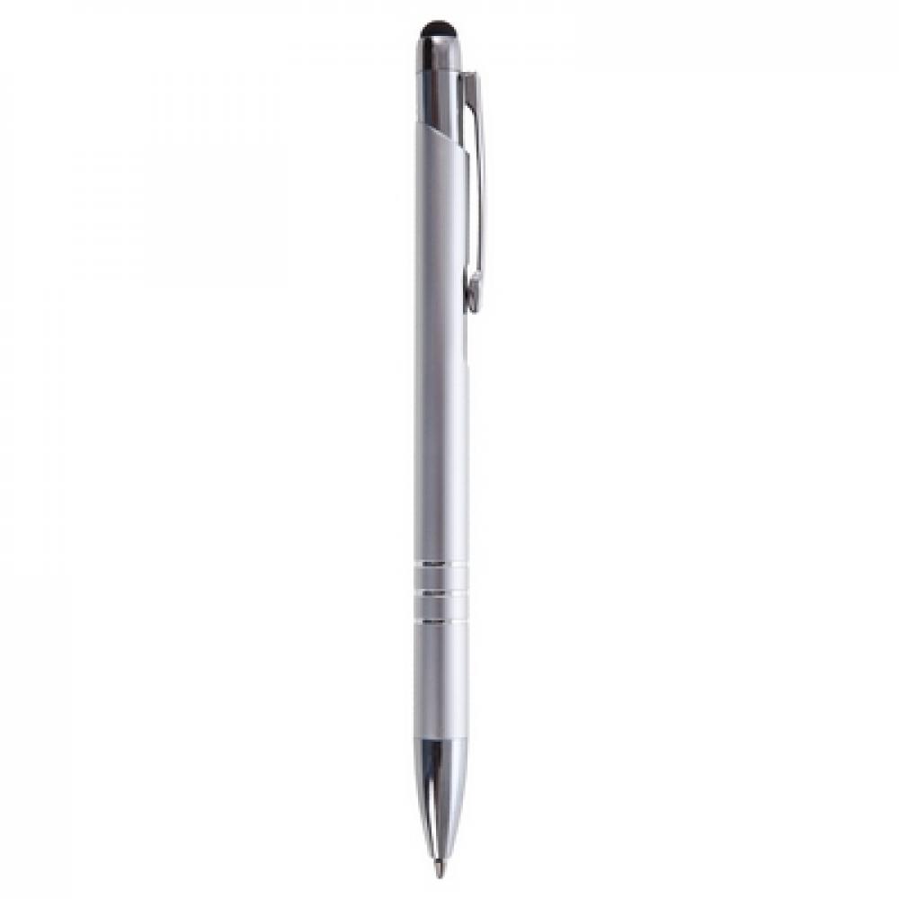 Шариковая ручка, стилус с черным резиновым наконечником, цветной корпус и серебристая отделка
