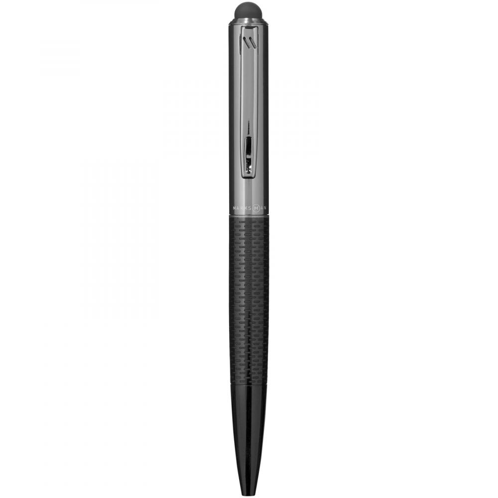 Эксклюзивная шариковая ручка-стилус с стильным узором на нижней части корпуса. В комплекте высококачественный черный стержень и подарочная коробка Marksman.