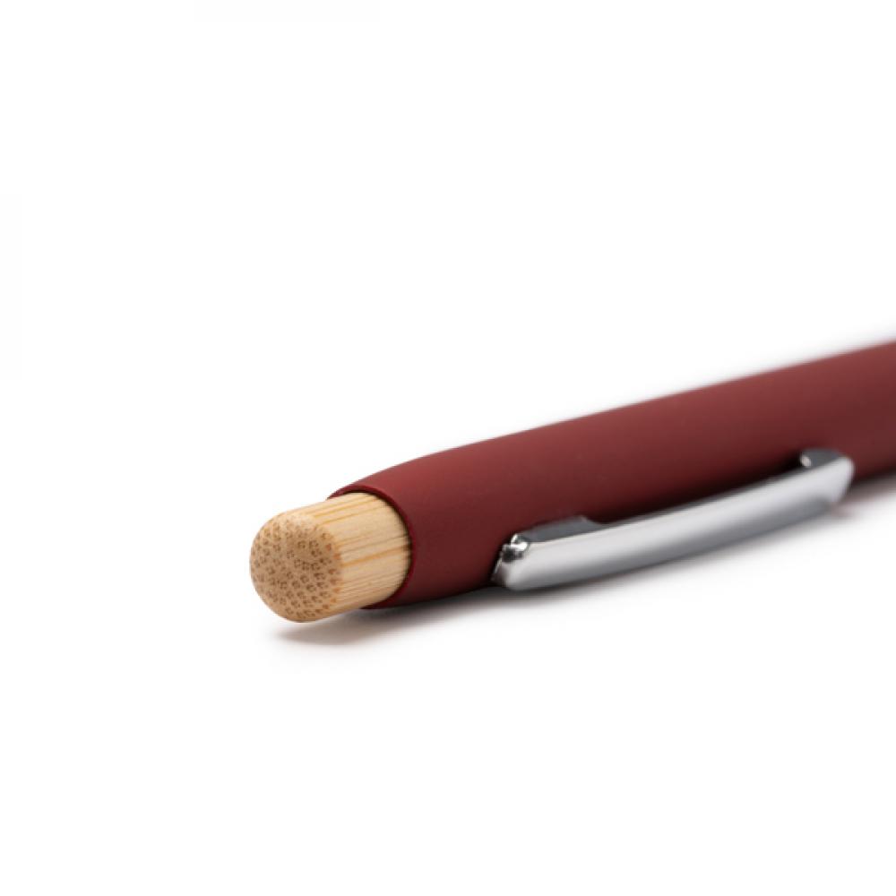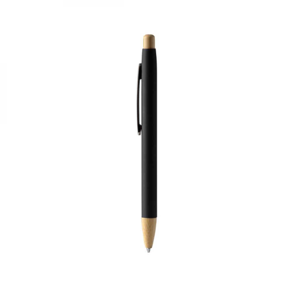 Шариковая ручка с металлическим покрытием и кнопкой, украшенная деталями из бамбука. Хромированный зажим. Синий стержень для ручки.