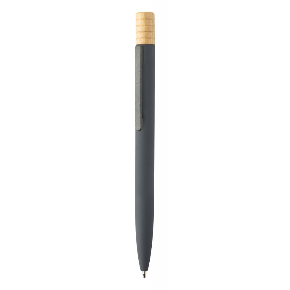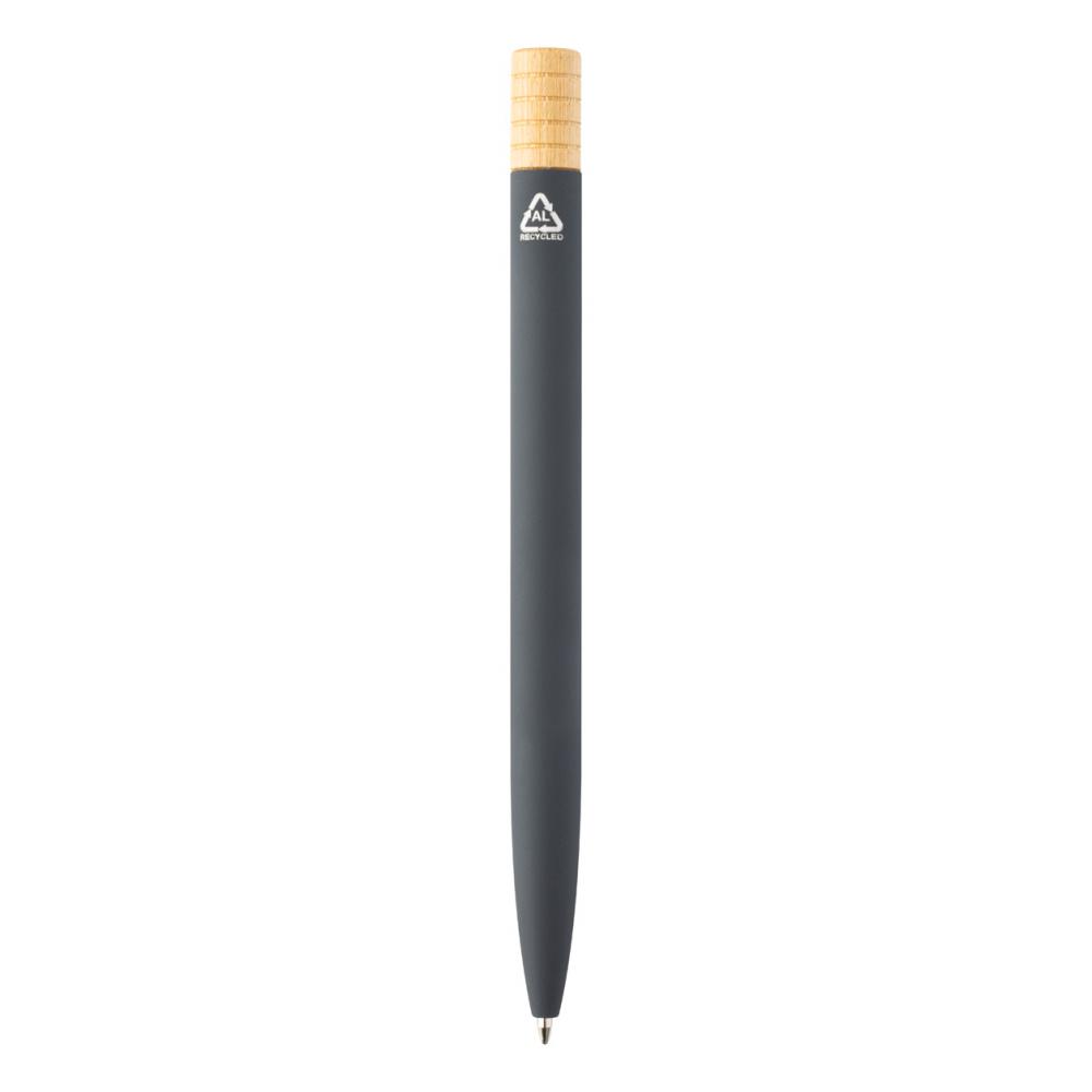 Шариковая ручка с поворотным механизмом из переработанного алюминия с зажимом с покрытием ганметаллик и верхушкой из бамбука. С синим стержнем. В коробке из крафт-бумаги.
