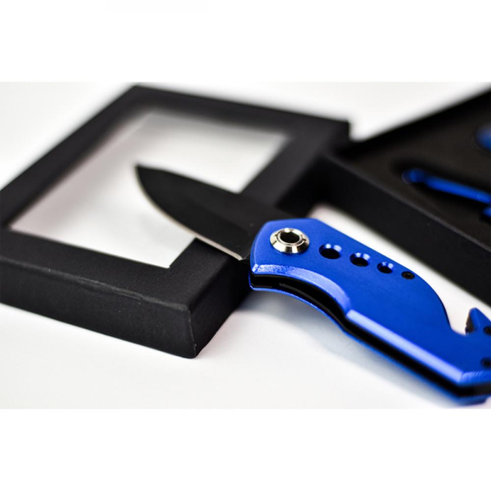 Складной нож 2CR13 с металлическим лезвием 58 мм, в комплект входит молоток для автомобильного стекла, нож для ремня безопасности и зажим для ремня. Поставляется с замком безопасности. Упакован в черный чехол из полиэстера.