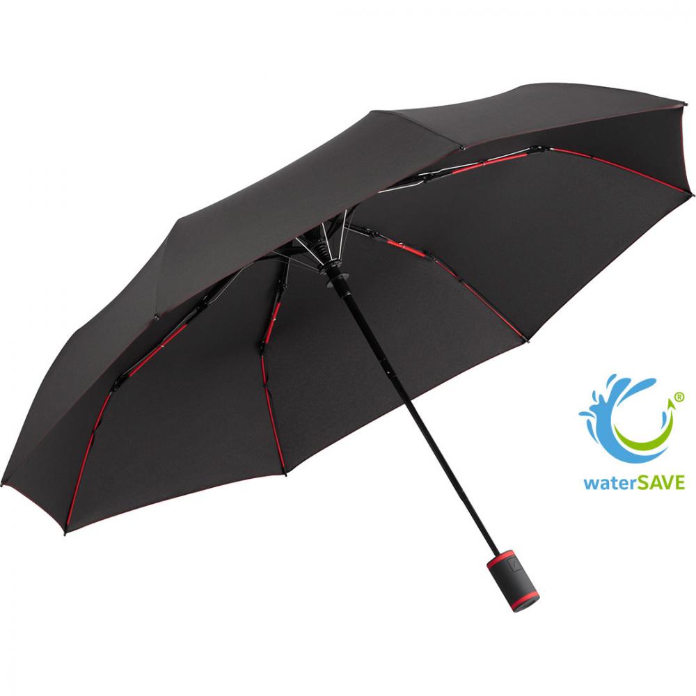Удобная автоматическая функция для быстрого открытия, высококачественная ветрозащитная система для максимальной гибкости каркаса в штормовых условиях, гибкие спицы из стекловолокна, материал полиэстер понже из переработанных пластиков, экологически чистый благодаря оригинальному материалу покрытия waterSAVE®, с этикеткой waterSAVE® на застежке (с новыми поставками), привлекательный дизайн благодаря цветным спицам, кольцам на ручке и швам, ручка с мягким покрытием и кнопкой, с возможностью нанесения рекламной надписи, удобный чехол с цветными швами и цветным гибким шнурком. Также доступен в виде другого мини-зонта.