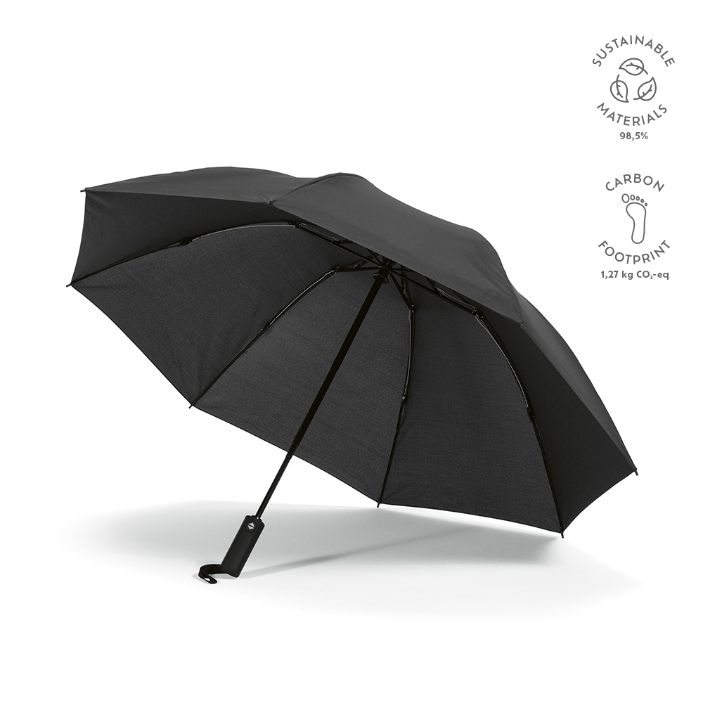 Этот 23-дюймовый складной зонт из переработанного ПЭТ с возможностью обратного складывания сохраняет вас сухим и предотвращает капание вокруг. Он имеет 8 спиц, автоматическое открытие и закрытие, а также ветроустойчивый каркас из стекловолокна. Зонт оснащен ручкой из переработанного ABS и поставляется в индивидуальном чехле из переработанного ПЭТ.
