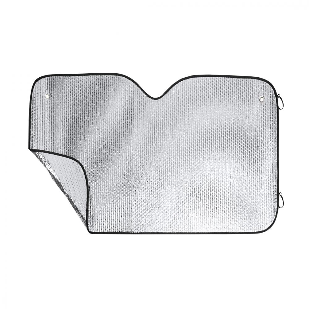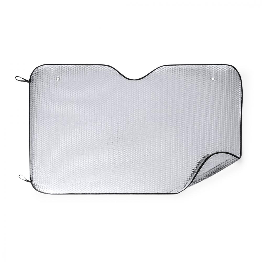 Особенности Алюминиевый солнцезащитный козырек с пузырьками с обеих сторон в серебристом металлическом исполнении с черной окантовкой. Размер 130х80см, с металлическими укрепляющими кольцами, эластичными ремешками для складывания, двумя присосками для регулировки и представления в развернутом виде для удобства печати.
