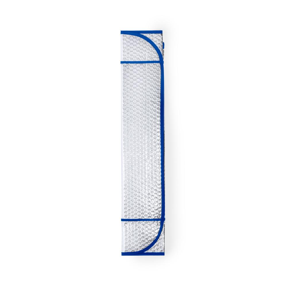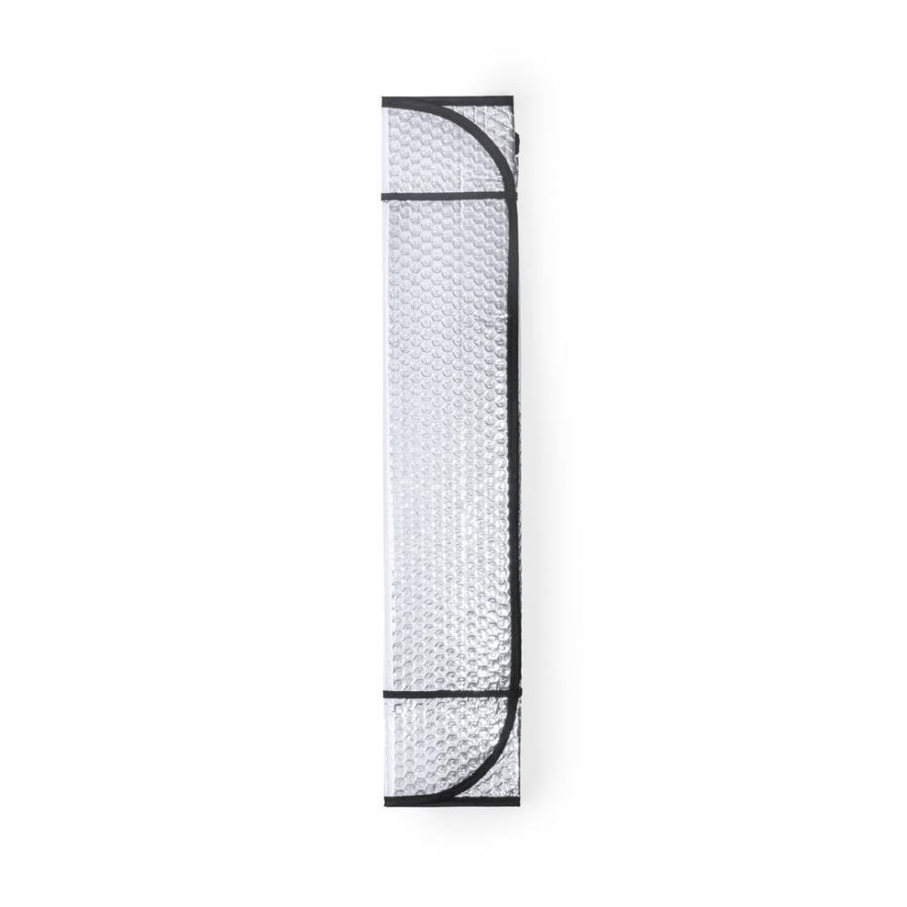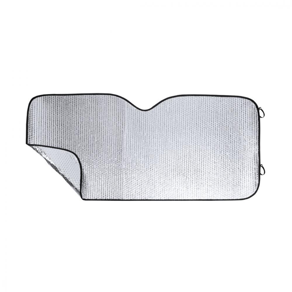 Особенности Алюминиевый солнцезащитный козырек с пузырьками с обеих сторон. Серебристый металлик с черной окантовкой и размером 130 х 70 см. С резинками для складывания и в разложенном виде для удобства печати, с отдельными пакетами.