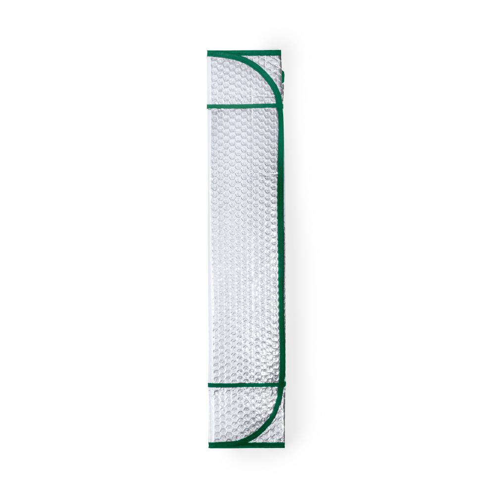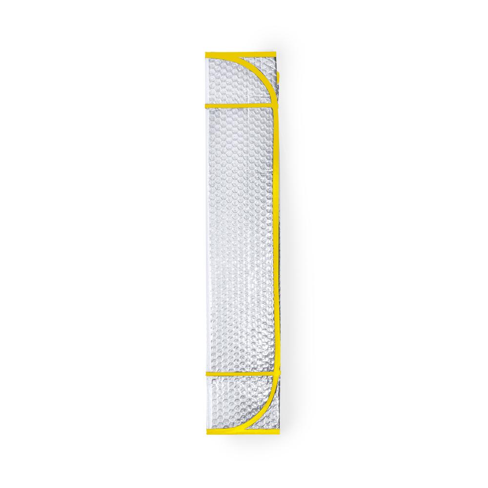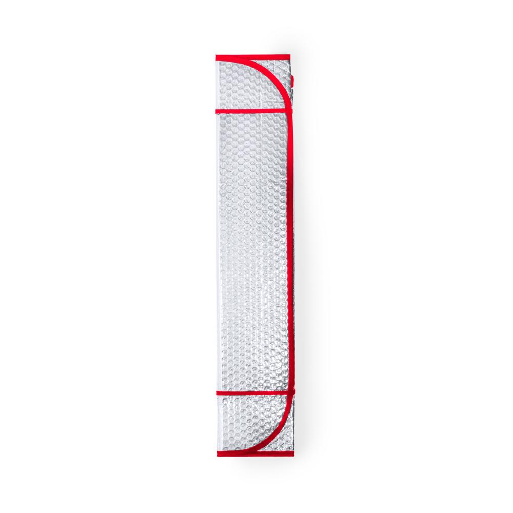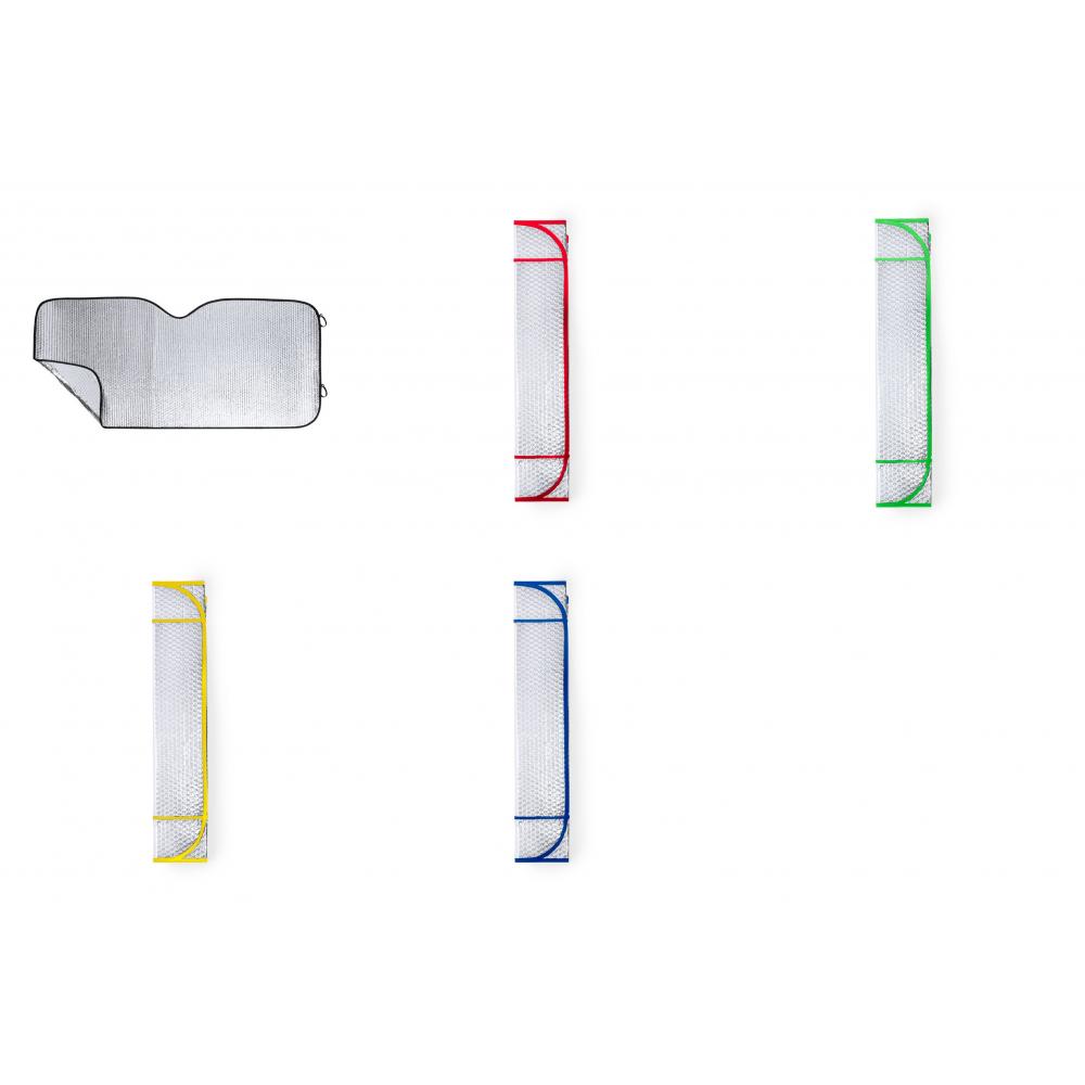 Особенности Алюминиевый солнцезащитный козырек с пузырьками с обеих сторон. Серебристый металлик с черной окантовкой и размером 130 х 70 см. С резинками для складывания и в разложенном виде для удобства печати, с отдельными пакетами.