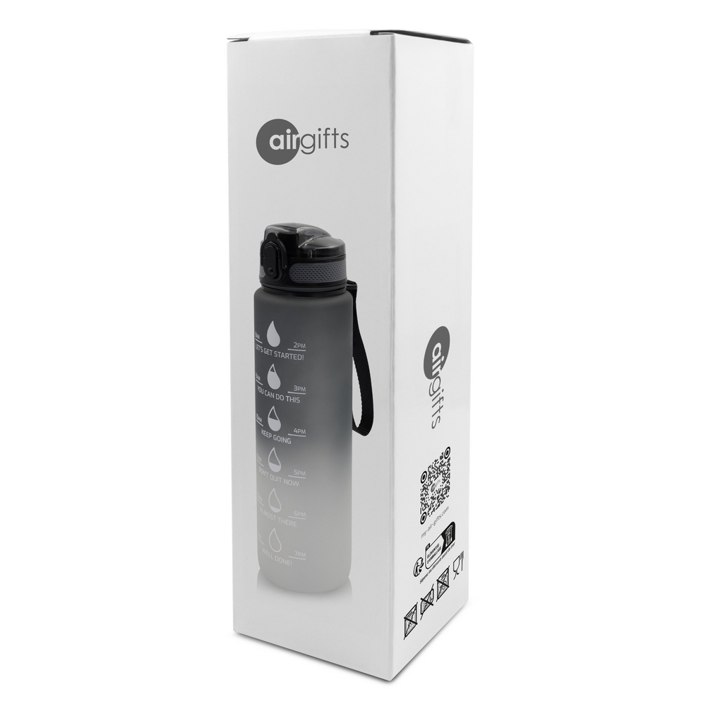 Спортивная бутылка 1000 мл Air Gifts с миллилитровой шкалой с одной стороны и мотивационной шкалой с другой, крышкой с замком, ремешком для руки, резиновым покрытием, подходит только для холодных и негазированных напитков.