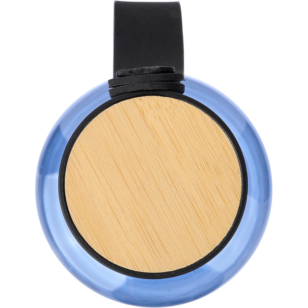 Спортивная бутылка объемом 750 мл с деталями из бамбука на верхней части, силиконовым ремешком для переноски, не подходит для посудомоечной машины, упакована индивидуально в переработанный полиэтиленовый пакет, изделие изготовлено из RPET, крышка из ПП.