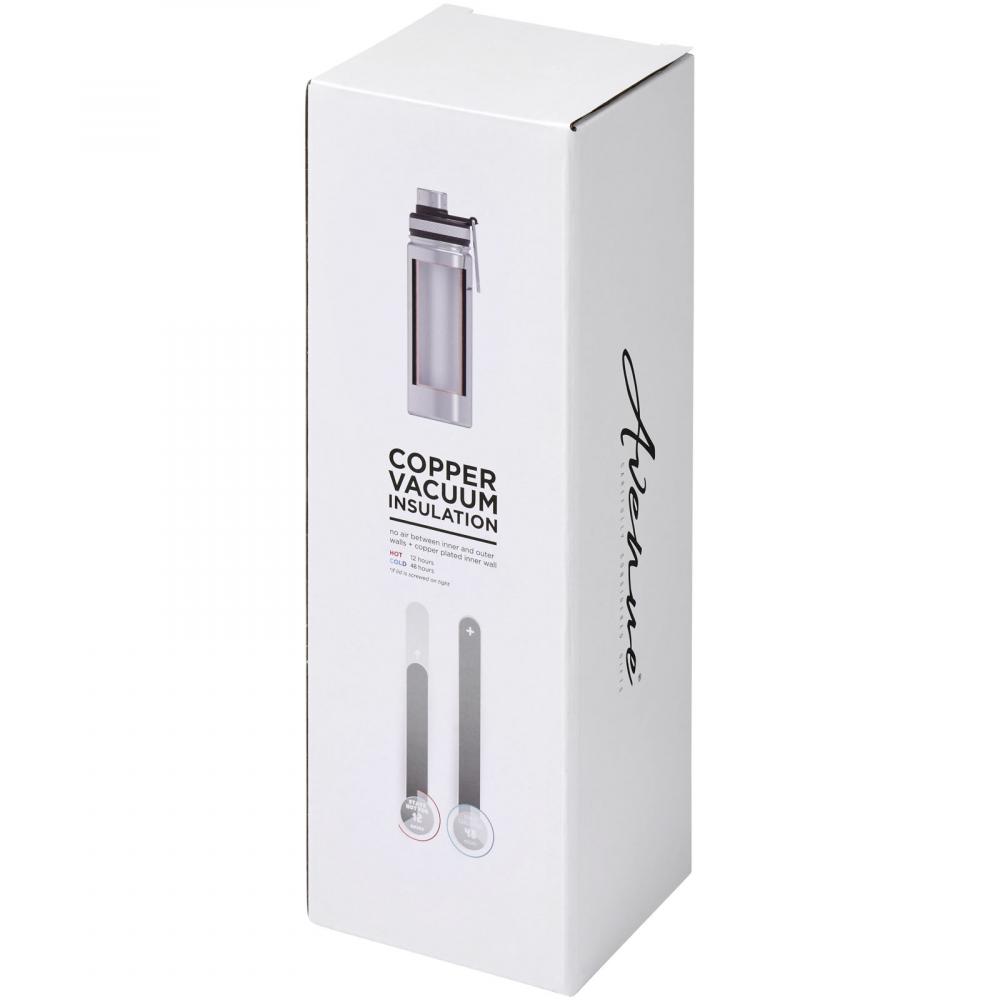 Двустенная вакуумная конструкция из нержавеющей стали с медной изоляцией, которая сохраняет напитки горячими в течение как минимум 12 часов и холодными в течение 48 часов. Конструкция также предотвращает образование конденсата на внешней стороне бутылки. Оснащена завинчивающейся крышкой и крышкой из нержавеющей стали с удобной ручкой для переноски. Двойное отверстие для легкой очистки и наполнения. Объем 590 мл. Поставляется в подарочной коробке Avenue.