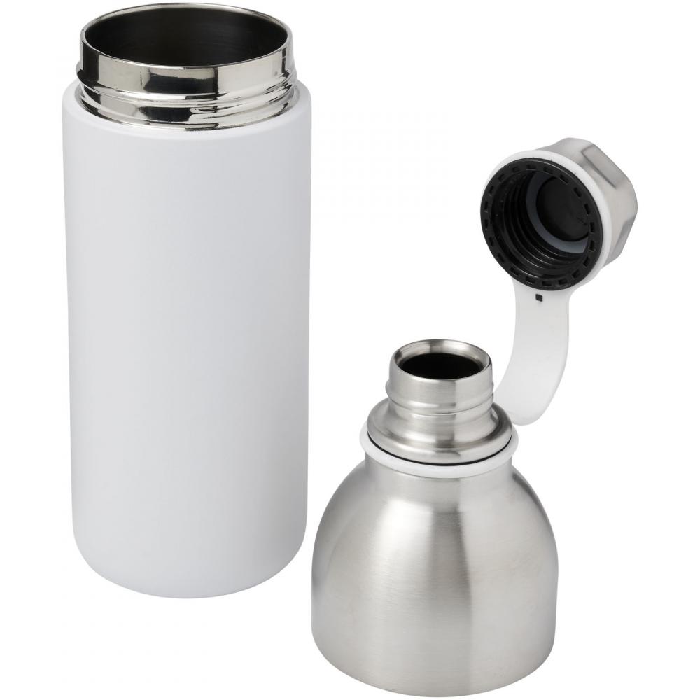 Двустенная вакуумная конструкция из нержавеющей стали с медной изоляцией, которая позволяет напиткам оставаться холодными в течение 48 часов или горячими не менее 12 часов. Конструкция также предотвращает образование конденсата на внешней стороне бутылки. Оснащена завинчивающейся крышкой и крышкой из нержавеющей стали с удобной силиконовой петлей для переноски. Двойное отверстие для легкой очистки и наполнения. Объем 590 мл. Поставляется в подарочной коробке Avenue.