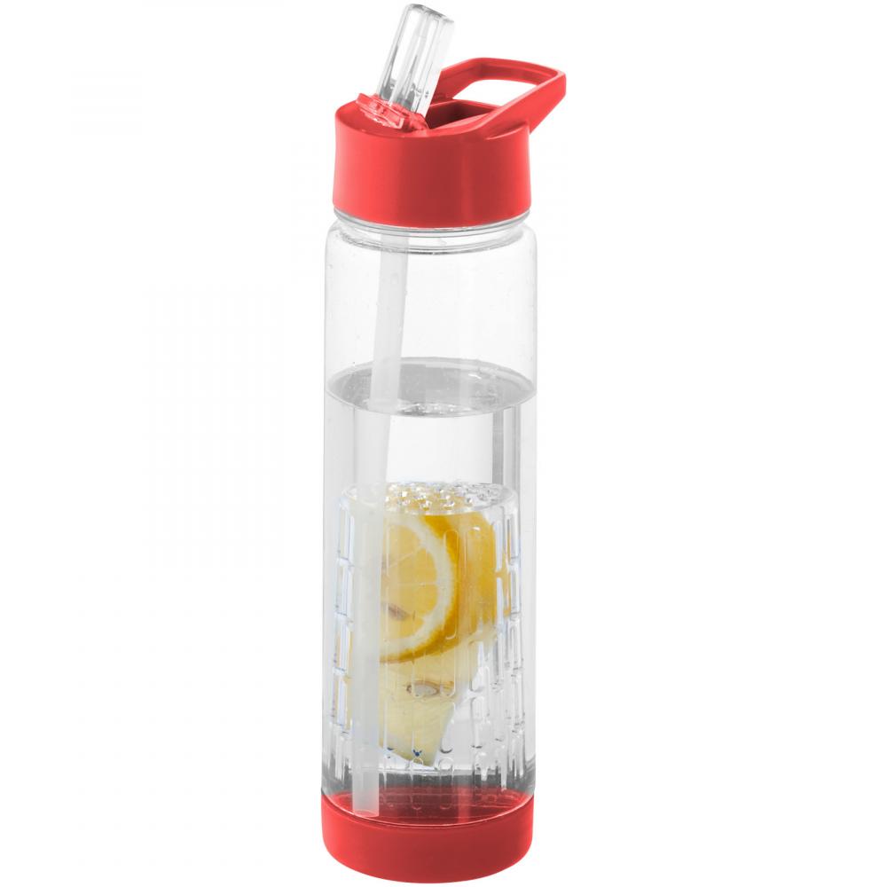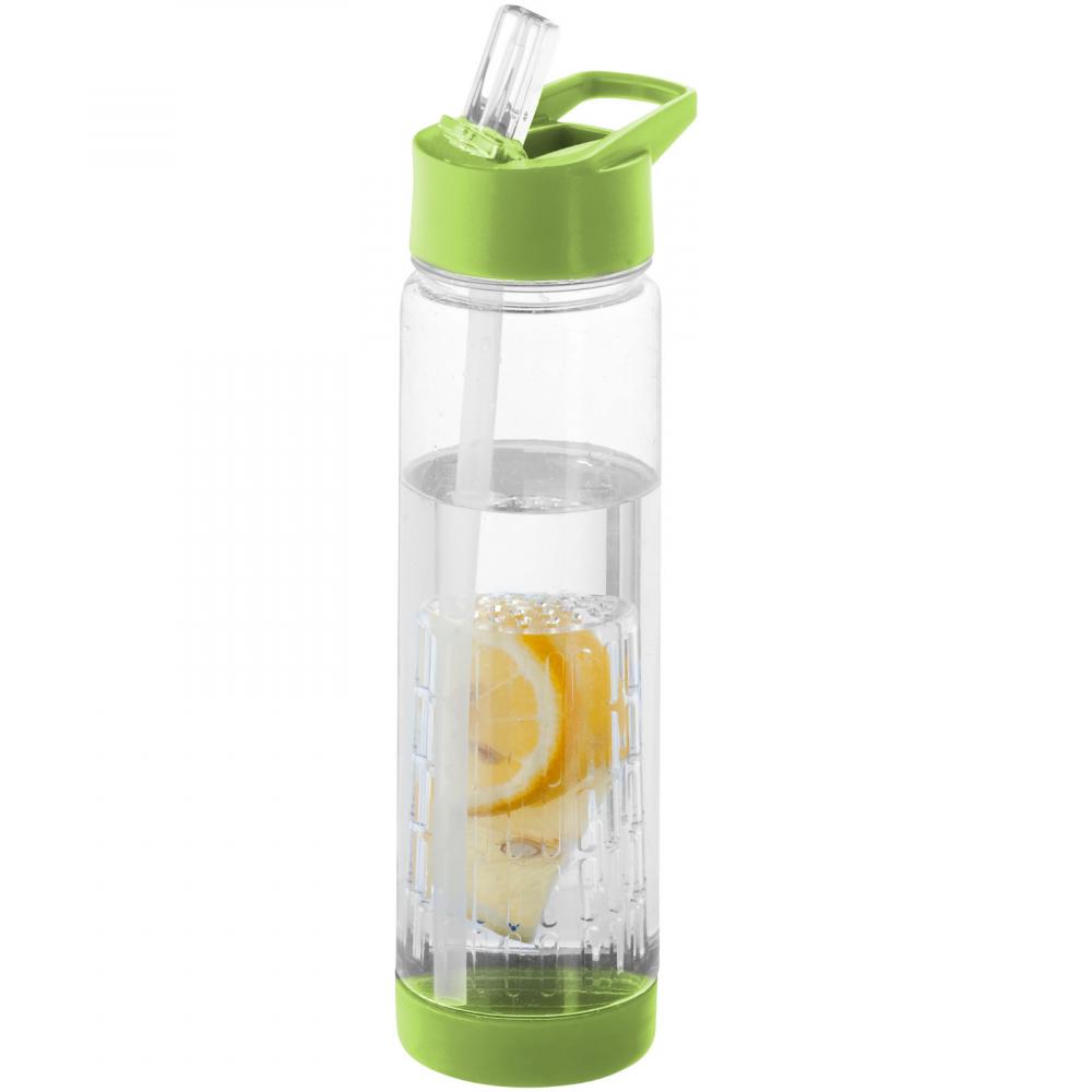 Tutti-frutti — это большая спортивная бутылка объемом 740 мл с дополнительными функциями. Она оснащена съемным инфузером для фруктов и трав, который позволяет создавать вкусные напитки. Бутылка удобна в использовании благодаря крышке с откидным носиком для питья. Сняв основание, можно легко получить доступ к инфузеру и очистить бутылку. Изготовлена из материала Eastman Tritan™, что делает её безвредной (не содержит BPA), легкой, прочной, не впитывающей запахи и устойчивой к ударам.