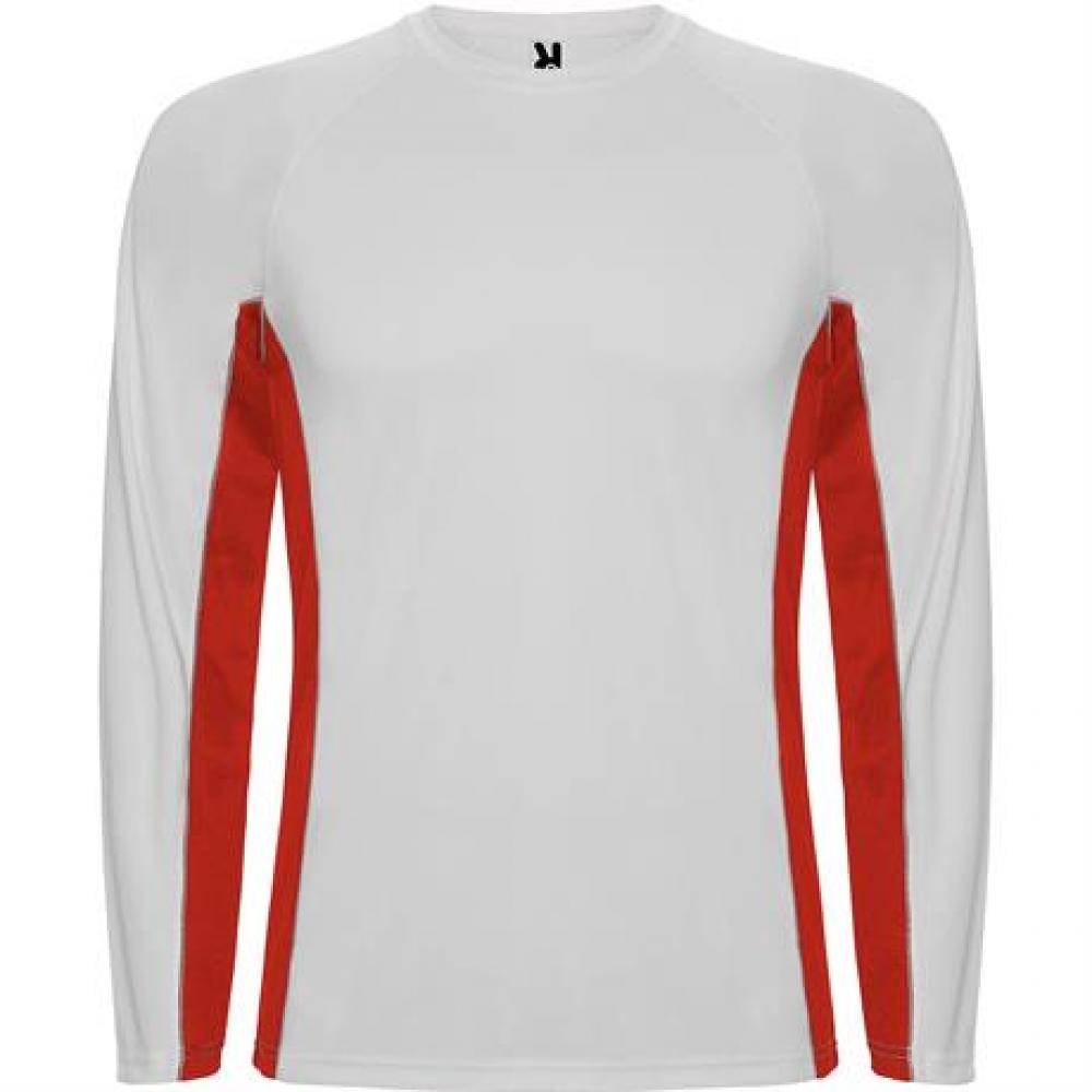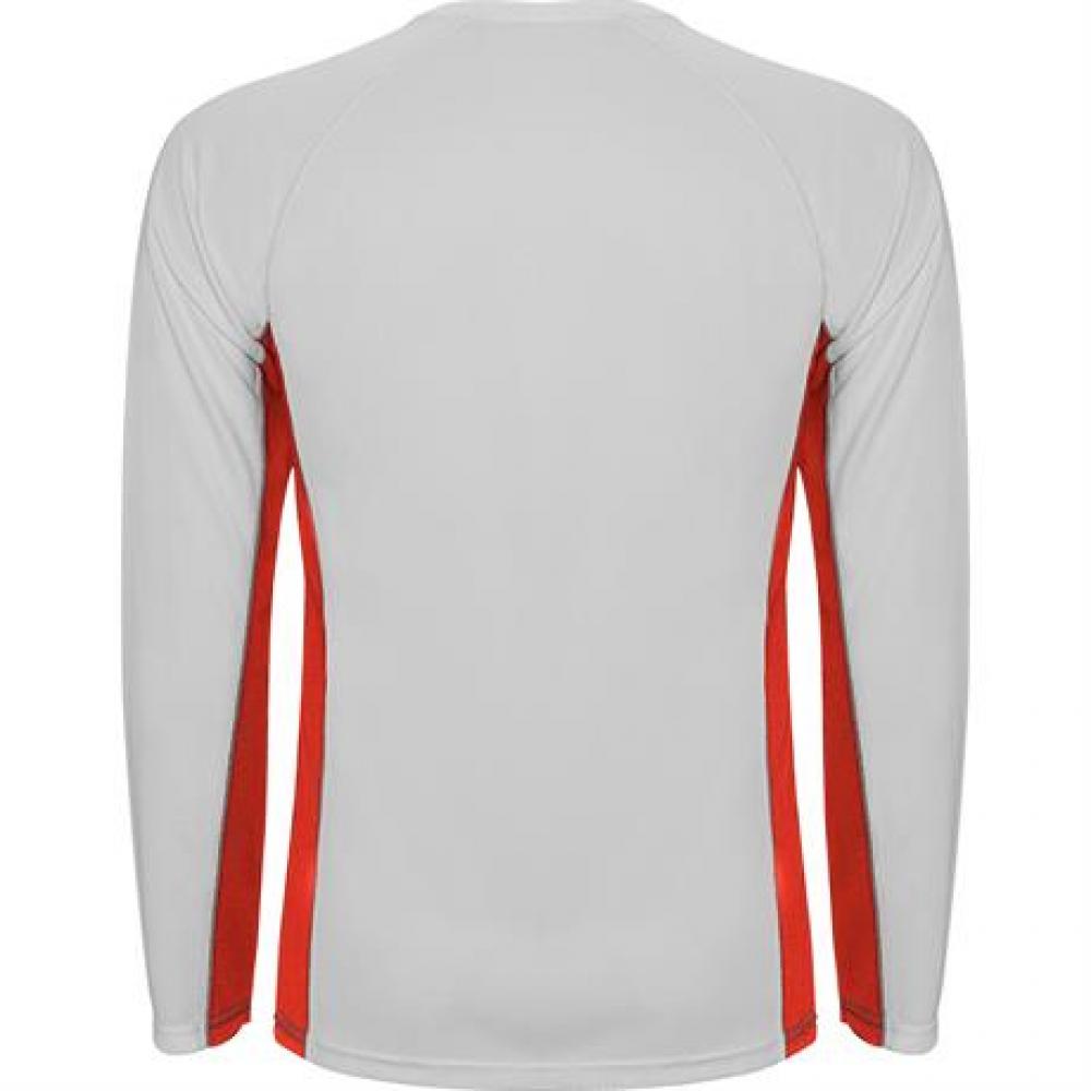 Спортивная футболка из двух комбинированных тканей из полиэстера. Длинные рукава реглан. Основная ткань — bird's eye, а боковые вставки и рукава с внутренней стороны — с микроперфорированной ткани. Круглая горловина с усиленными закрытыми внутренними швам