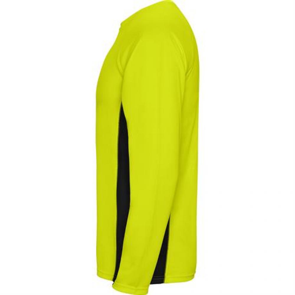 Спортивная футболка из двух комбинированных тканей из полиэстера. Длинные рукава реглан. Основная ткань — bird's eye, а боковые вставки и рукава с внутренней стороны — с микроперфорированной ткани. Круглая горловина с усиленными закрытыми внутренними швам