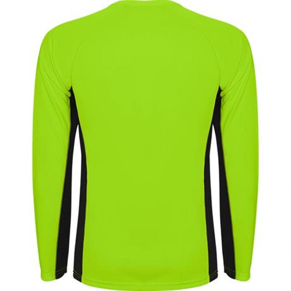 Спортивная футболка из двух комбинированных тканей из полиэстера. Длинные рукава реглан. Основная ткань — bird's eye, а боковые вставки и рукава с внутренней стороны — с микроперфорированной ткани. Круглая горловина с усиленными закрытыми внутренними швам
