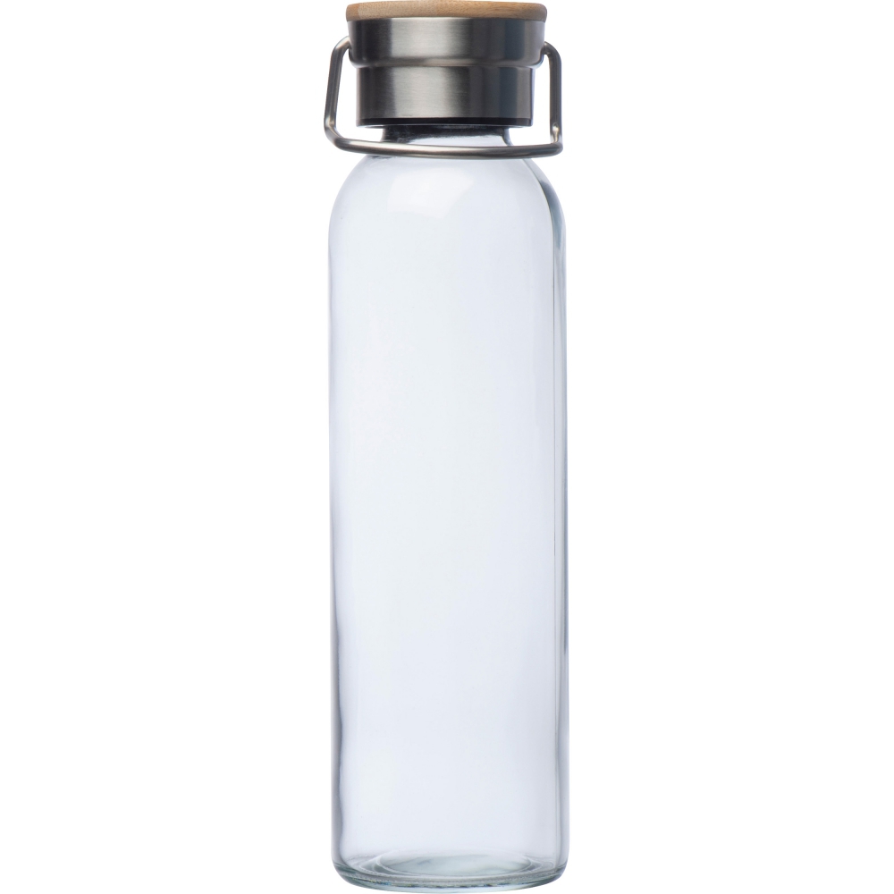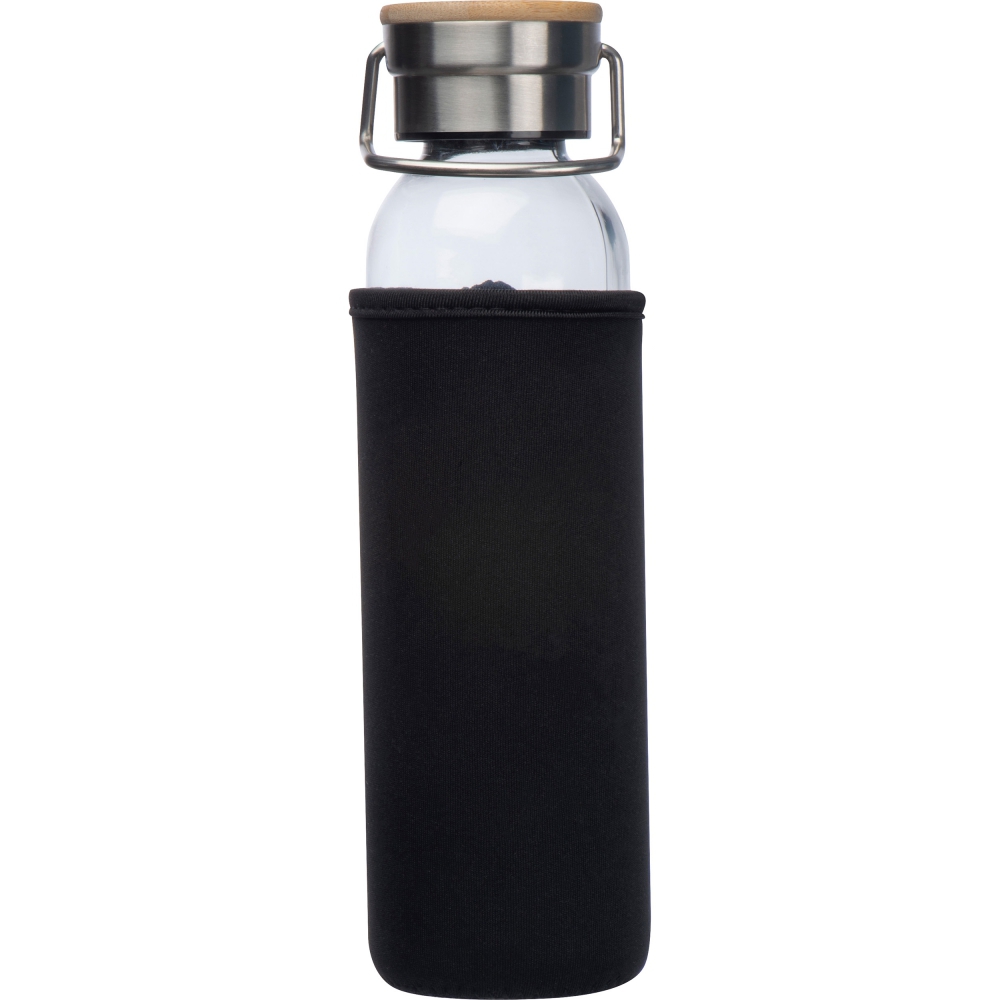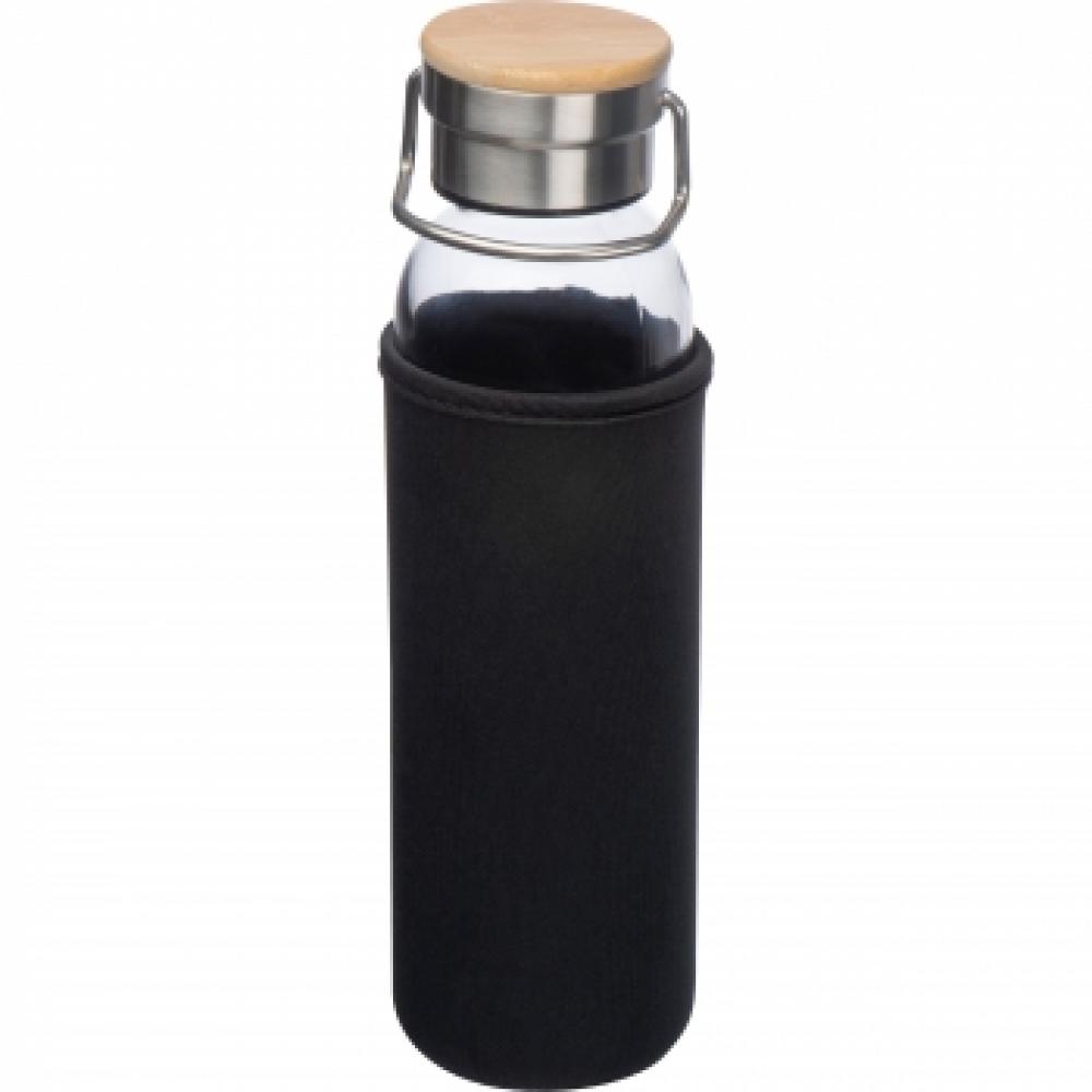 Стеклянная бутылка емкостью 600 мл с крышкой из нержавеющей стали и бамбуковым затвором. Бутылка защищена от повреждений неопропановым чехлом.