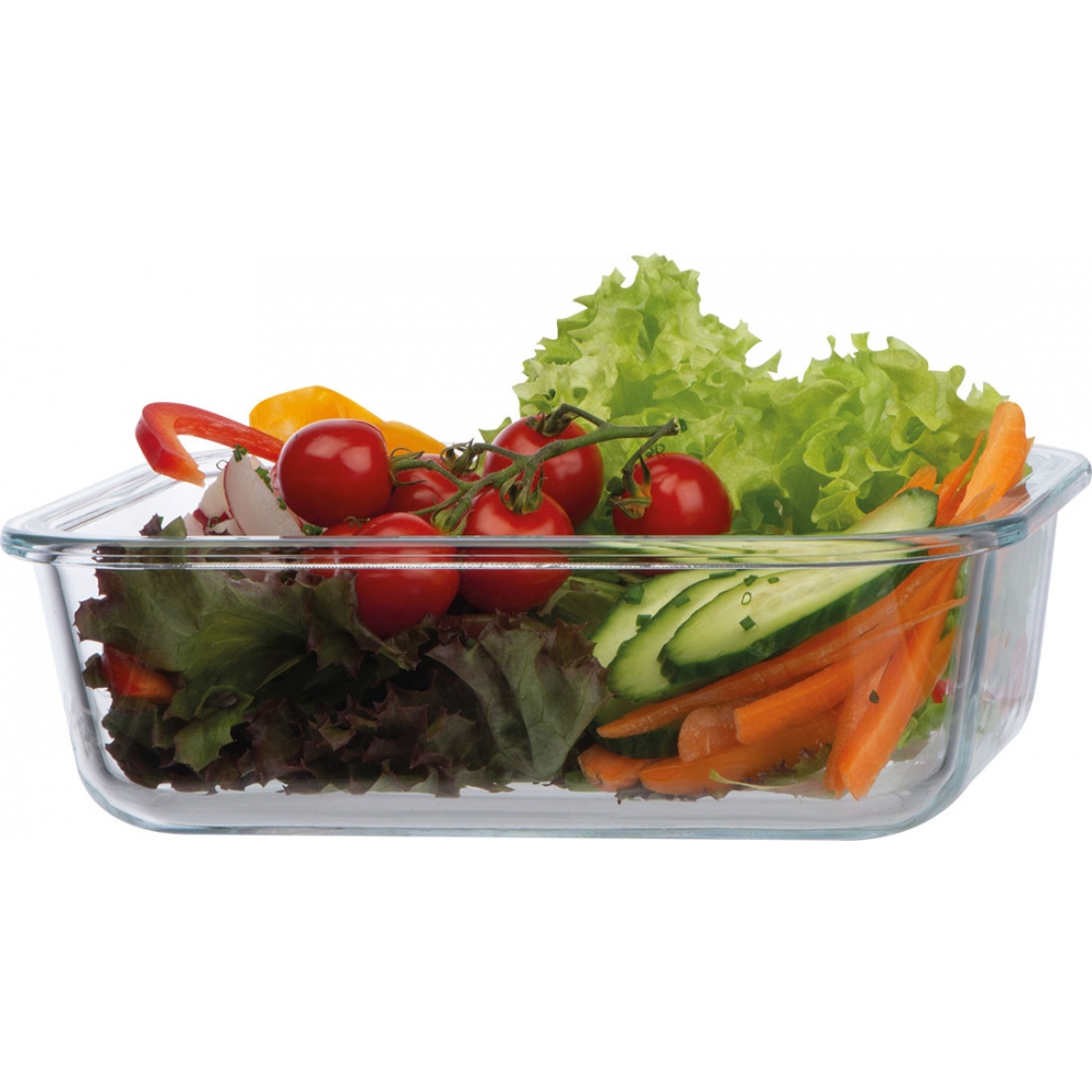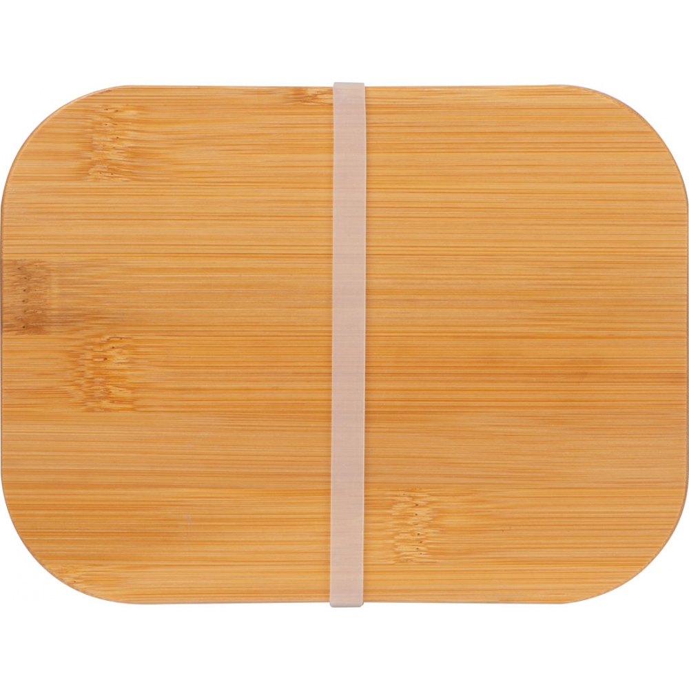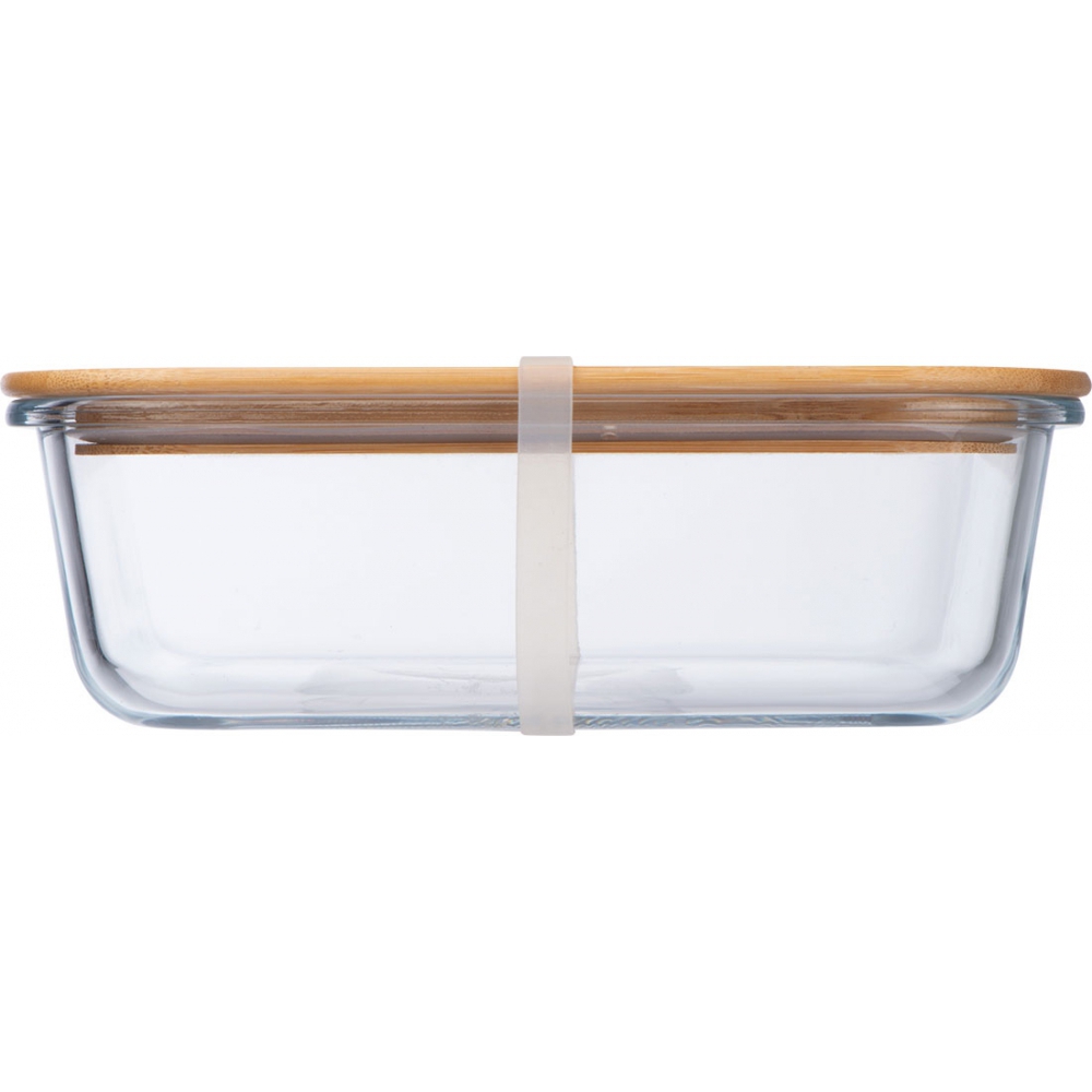 Ланчбокс из боросиликатного стекла с бамбуковой крышкой и гибким силиконовым ремешком. Ваш логотип будет выгравирован на крышке.