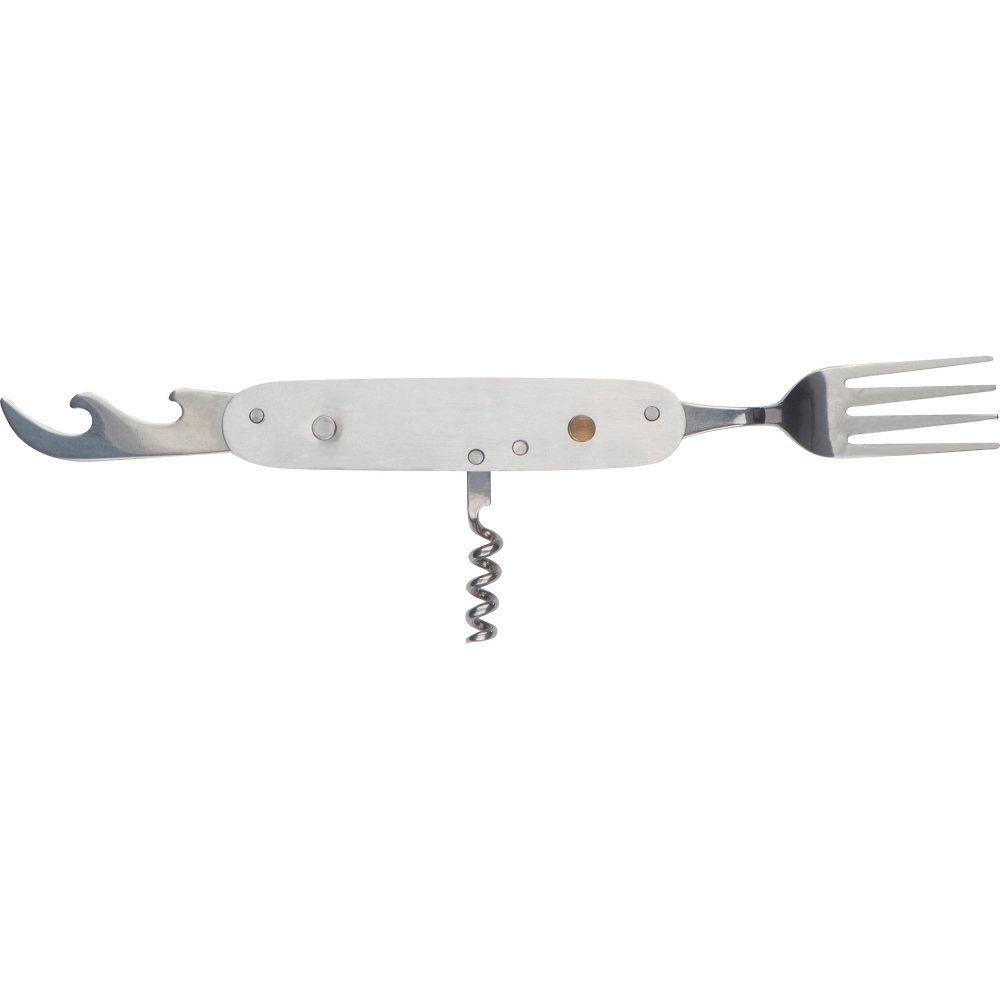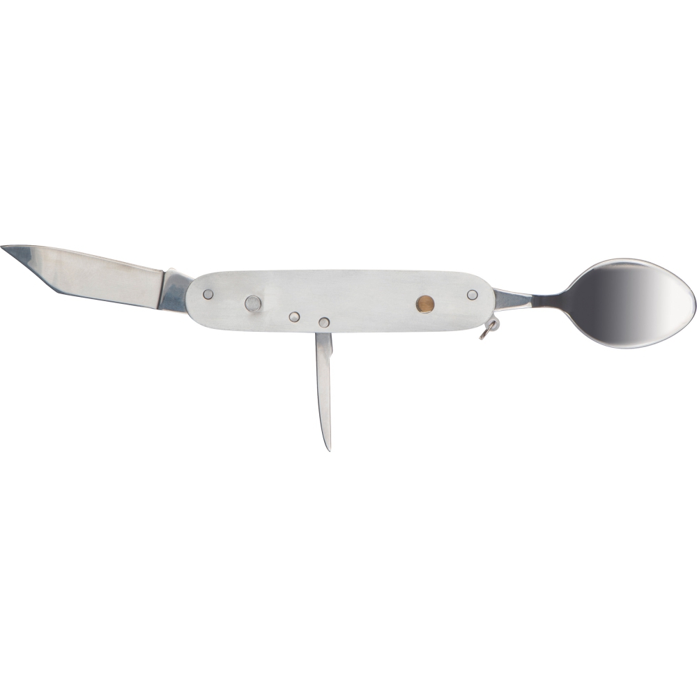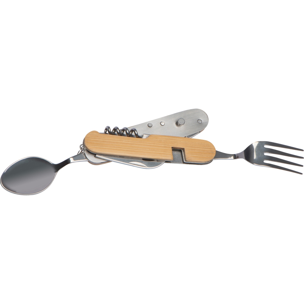 Разборные походные столовые приборы из нержавеющей стали с бамбуковыми раковинами. Ложка, перочинный нож и нож для фольги с одной стороны, открывалка для бутылок, вилка и штопор с другой.