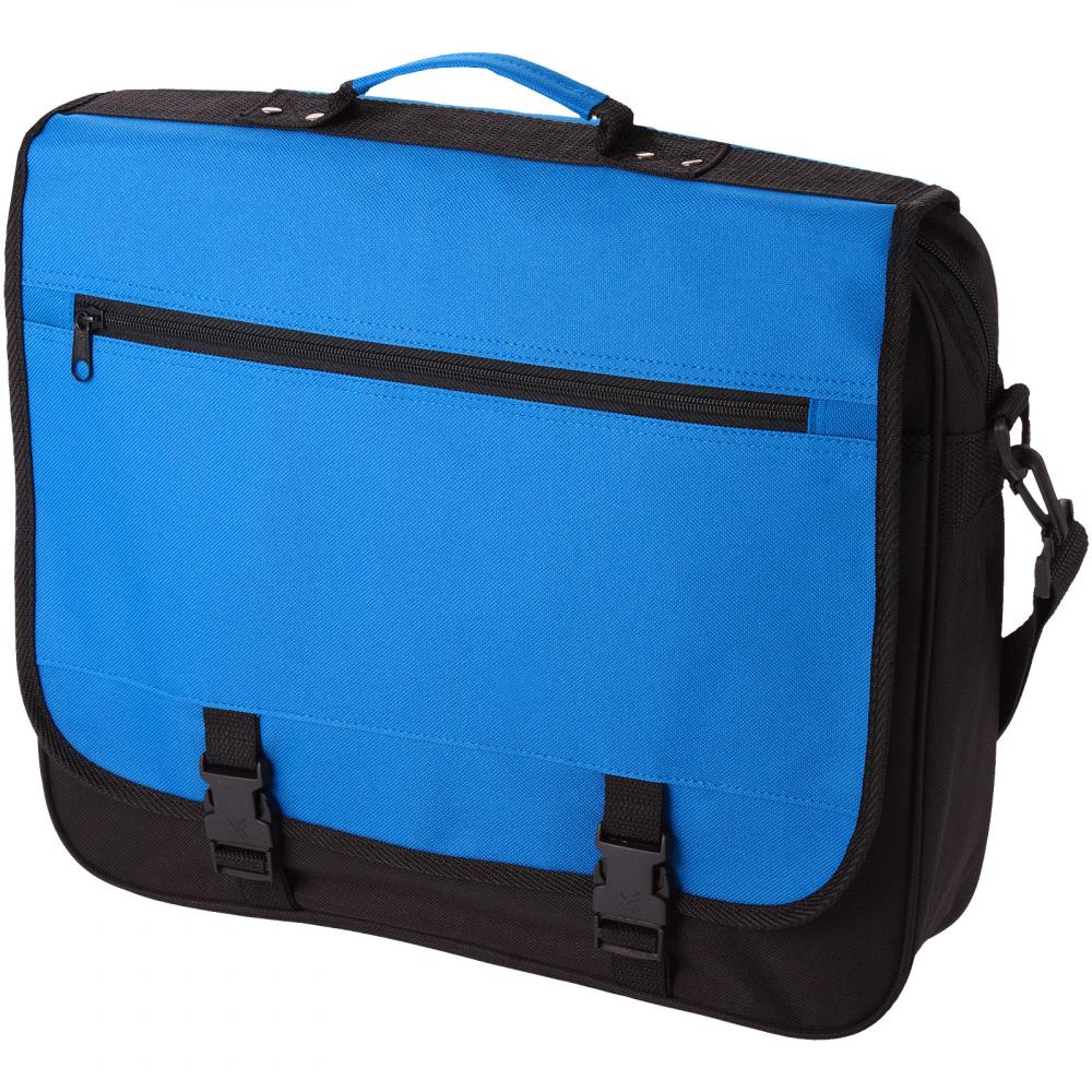 Сумка для выставок с регулируемым плечевым ремнем, клапаном на пряжке, карманом на молнии в клапане, основным отделением на молнии и несколькими открытыми карманами под клапаном.