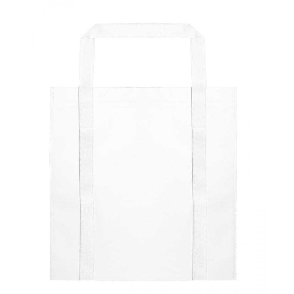 Практичная и удобная большая покупочная сумка из нетканого материала плотностью 80 г/м² с усиленными ручками длиной 58 см и сшитой отделкой.