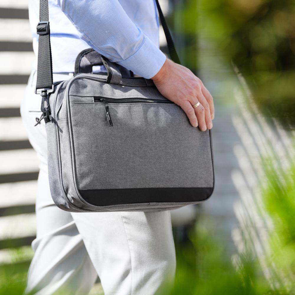 Сумка для документов из меланжевой ткани с ручками и съемным плечевым ремнем. Имеет внешний карман на молнии, два основных отделения, оба закрываются на молнии. Внутри 5 небольших карманов, ящик для инструментов, карман для телефона и карман на молнии.