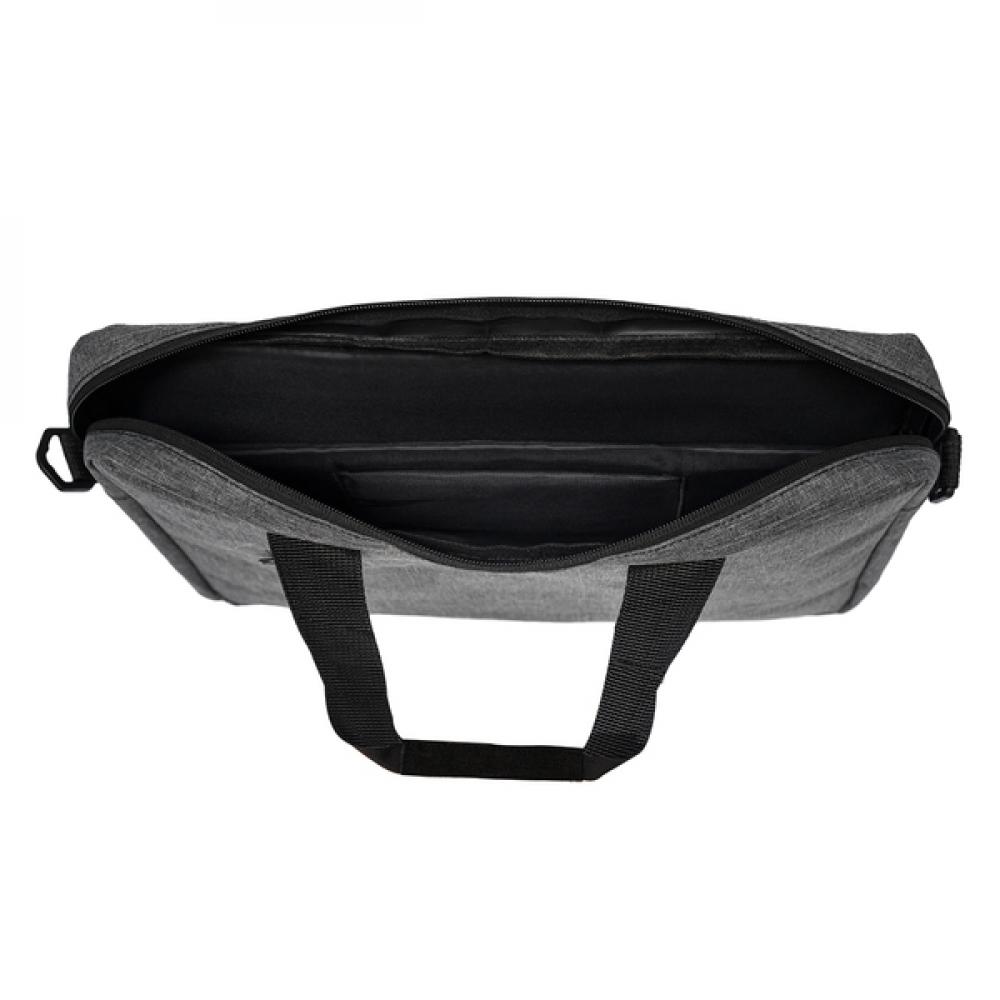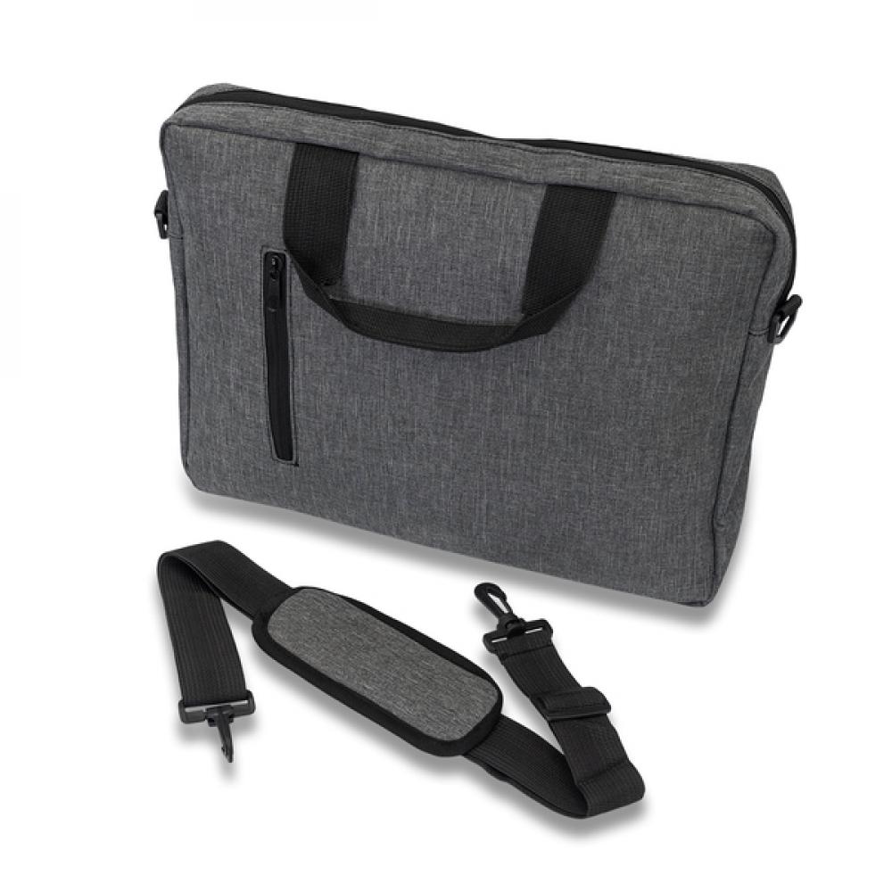 Сумка для ноутбука размером 15 дюймов с внутренним отделением. Съемный ремень позволяет носить сумку на плече. Она имеет внешний карман на молнии. Дополнительный ремень на задней части сумки позволяет разместить ее на ручке чемодана.
