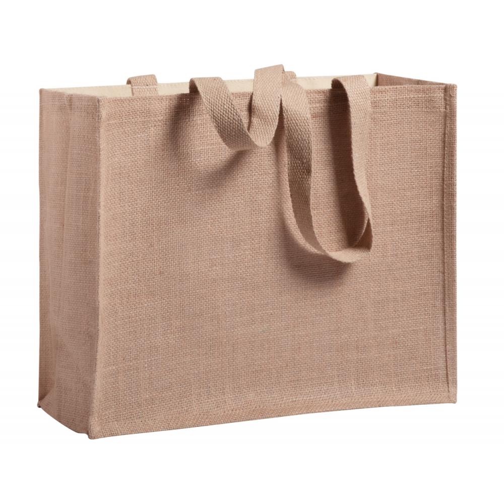 Сумка-шоппер из комбинации ламинированного джута и ламинированного хлопка с длинными ручками.