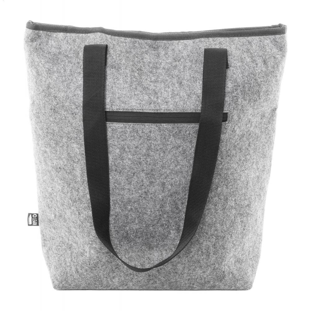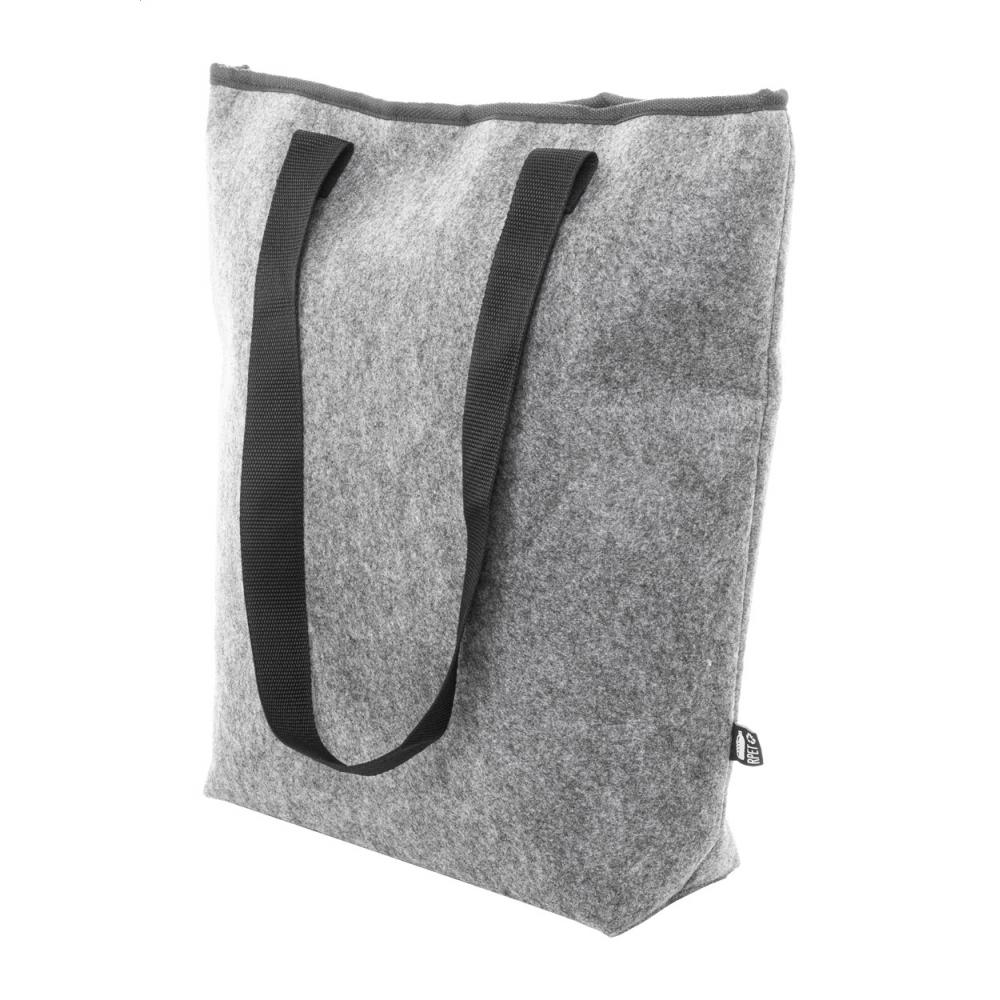 Стильная покупочная сумка из фетра RPET с алюминиевой подкладкой. С застежкой на липучке, карманом на молнии спереди и длинными ручками. С характерным ярлыком RPET.