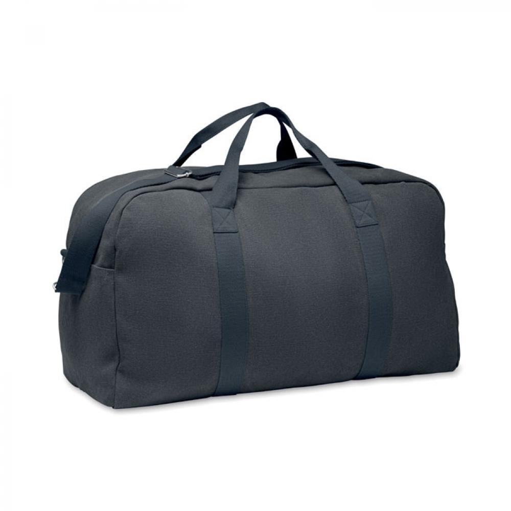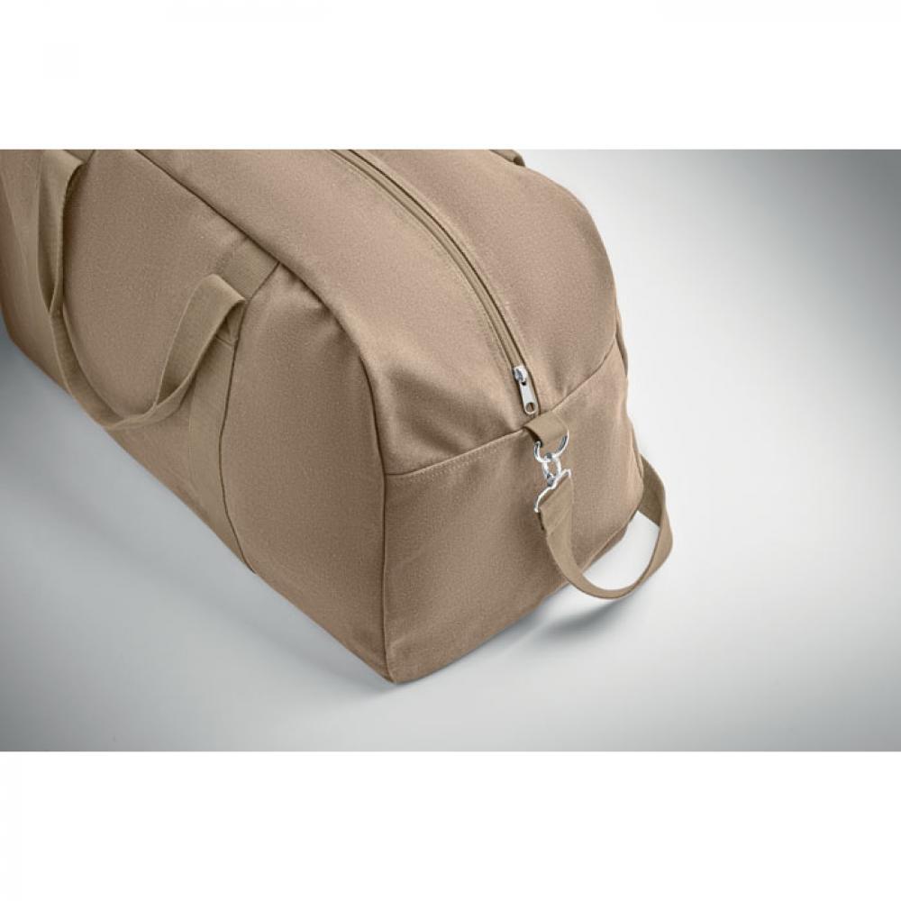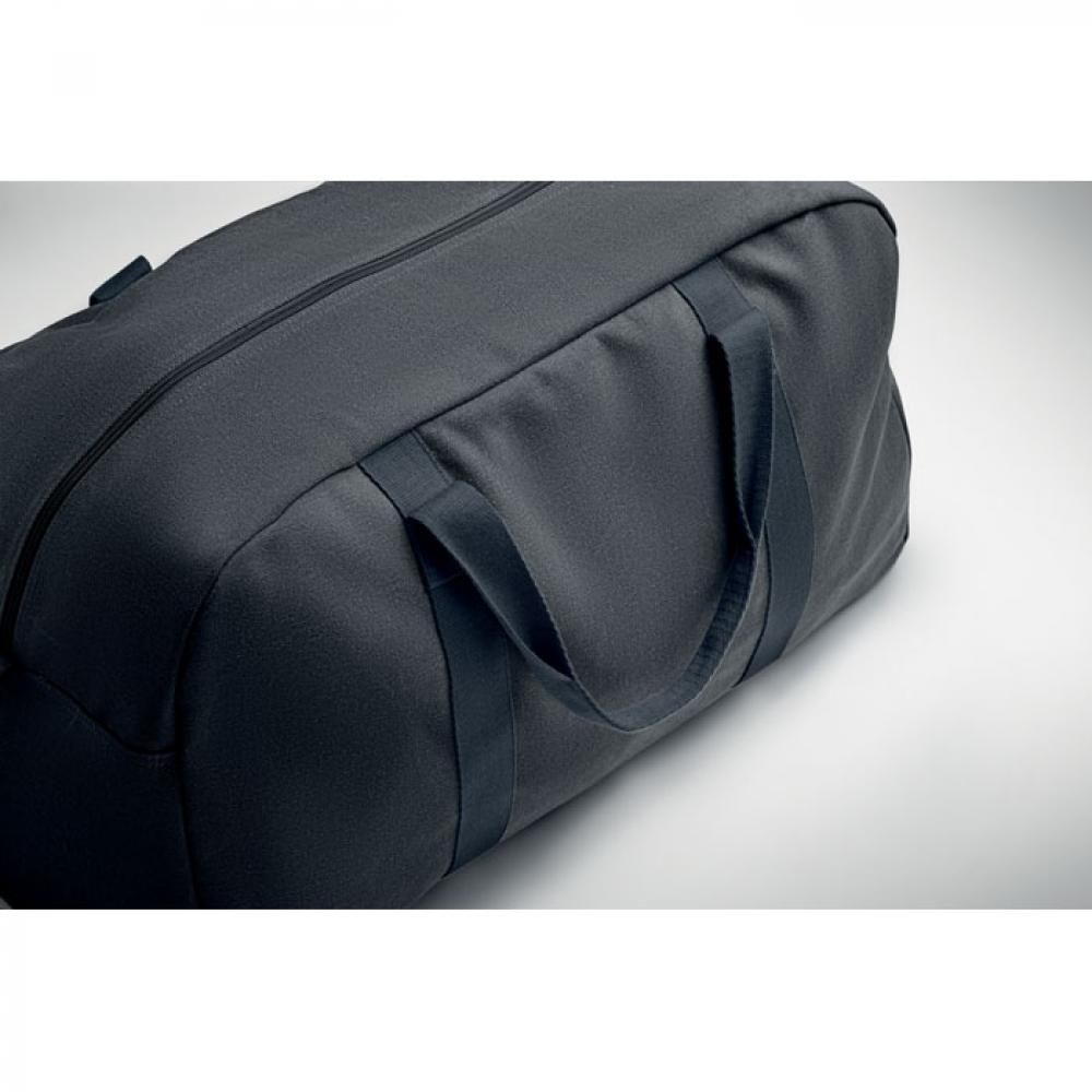 Дорожная сумка из переработанного материала плотностью 450 гр/м² (60% переработанного хлопка и 40% переработанного полиэстера) с регулируемым съемным ремнем из хлопка.