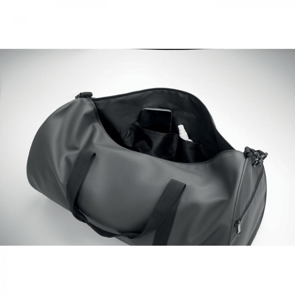 Дорожная сумка из полиэстера 600D RPET с полиуретановым покрытием. Передний карман на молнии. Внутри подкладка из полиэстера 210D RPET. 1 боковое отделение на молнии / 1 боковое отделение из сетки. Внутренний карман на молнии.