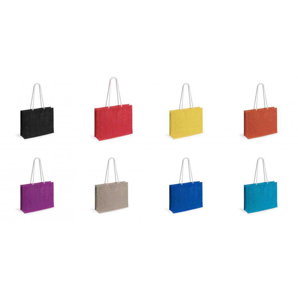 Особенности Джутовая сумка в широкой гамме ярких цветов. С длинными усиленными хлопчатобумажными ручками длиной 70 см белого цвета. Прошитая отделка и устойчивость к весу до 10 кг. Ламинированный Джут/Хлопок