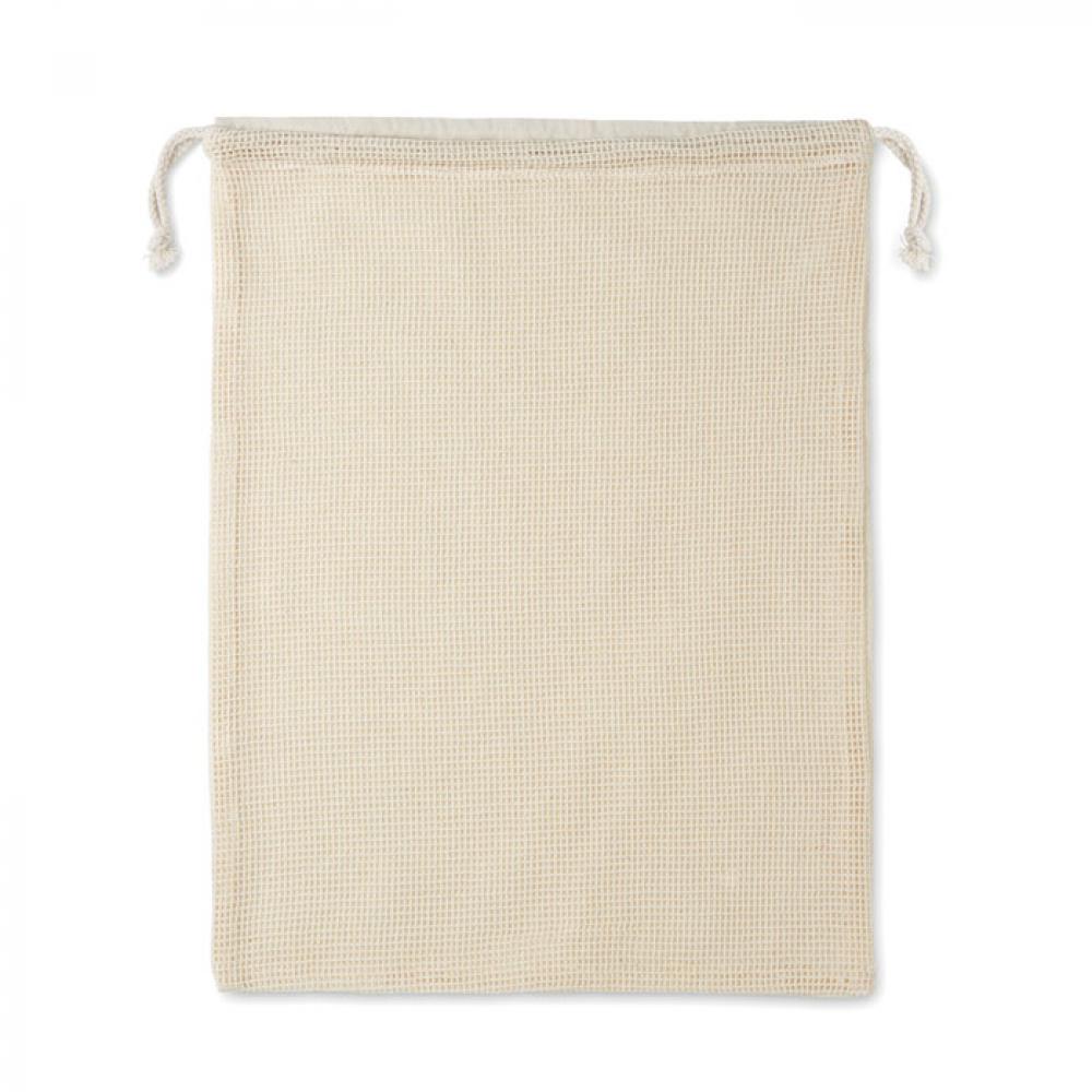 Сумка многоразовая. Одна сторона из хлопка (140 г / м²), а другая - из сетки (110 г / м²). Стягивается кулиской.