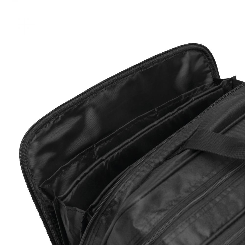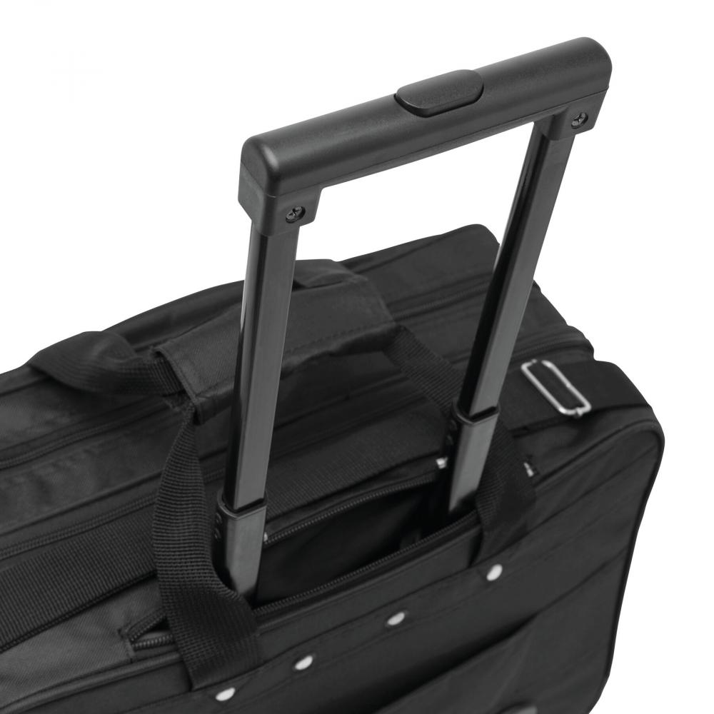 Деловой кейс MANAGER с телескопической тележкой на колесах для конькобежцев, 1 центральное основное отделение на молнии с карманом для ноутбука, 1 заднее отделение на молнии с разделителем для документов, 1 передний карман с разделителем для документов формата A4 и еще один передний карман с функцией органайзера со сменным металлическим логотипом, 1 навесной замок и регулируемый съемный плечевой ремень.