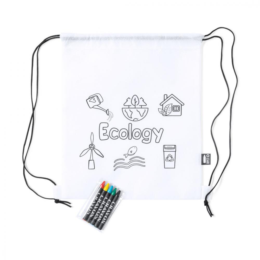 Сумка с затяжками из нетканого материала RPET белого цвета, специально разработанный для раскрашивания мелками. В том числе 5 цветных карандашей разных цветов. С черными закрывающими завязками и усиленными углами. Внешняя этикетка с отличительным знаком RPET.Материал RPET изготовлен из переработанного пластика, чтобы стимулировать повторное использование пластиковых отходов и способствовать устойчивому развитию планеты. В комплекте 5 цветных карандашей Нетканый RPET