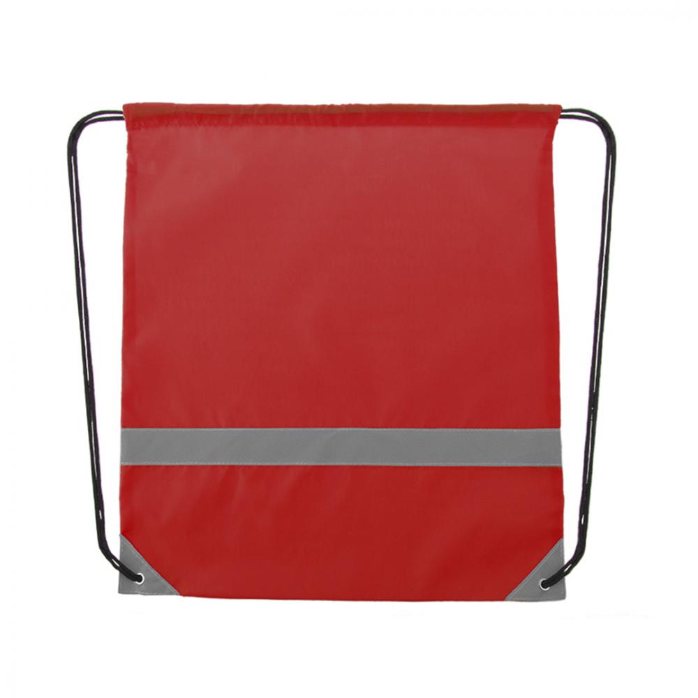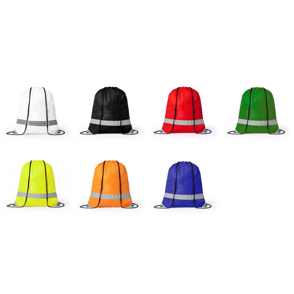 Светоотражающая сумка из мягкого полиэстера 190T ярких тонов со светоотражающей передней полосой. Самозакрывающиеся черные завязки и отражающие уголки, усиленные металлическими кольцами. Отражающий Полиэстер 190T