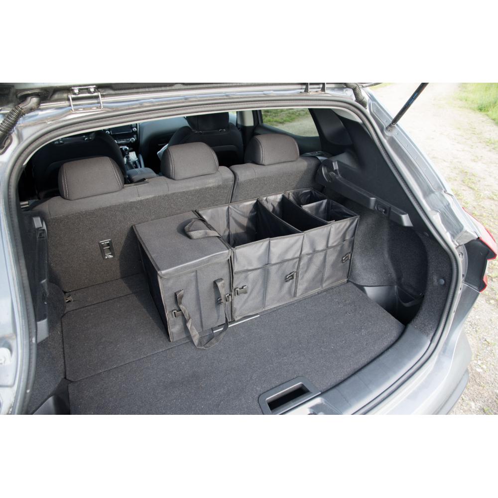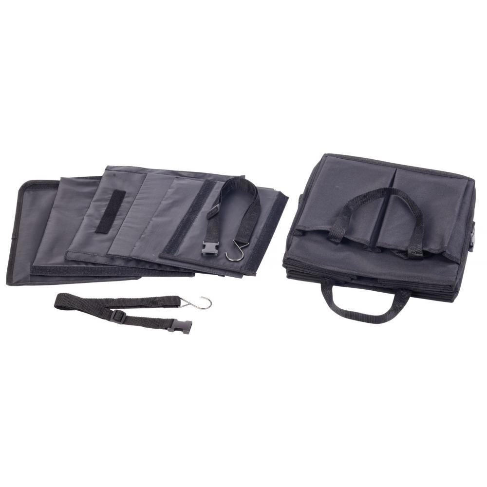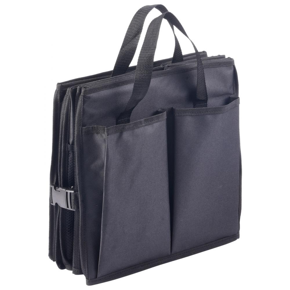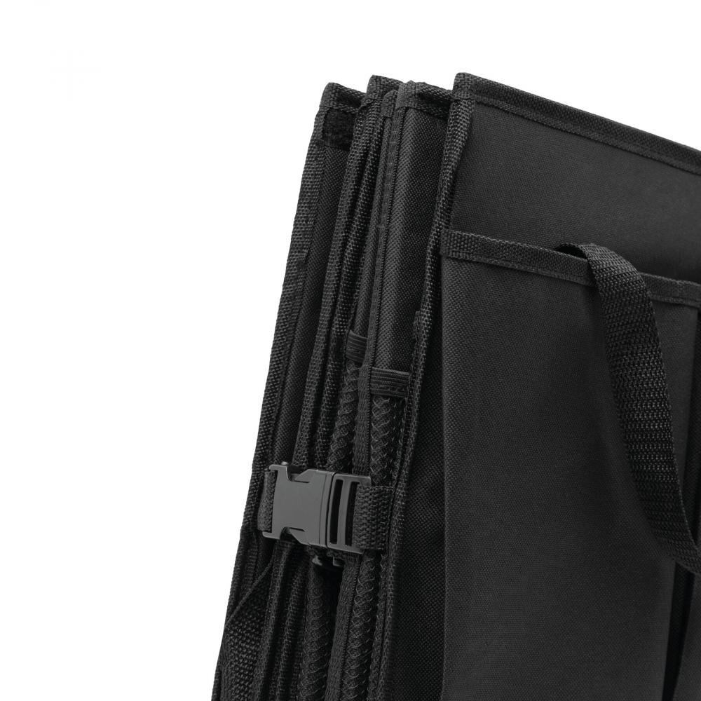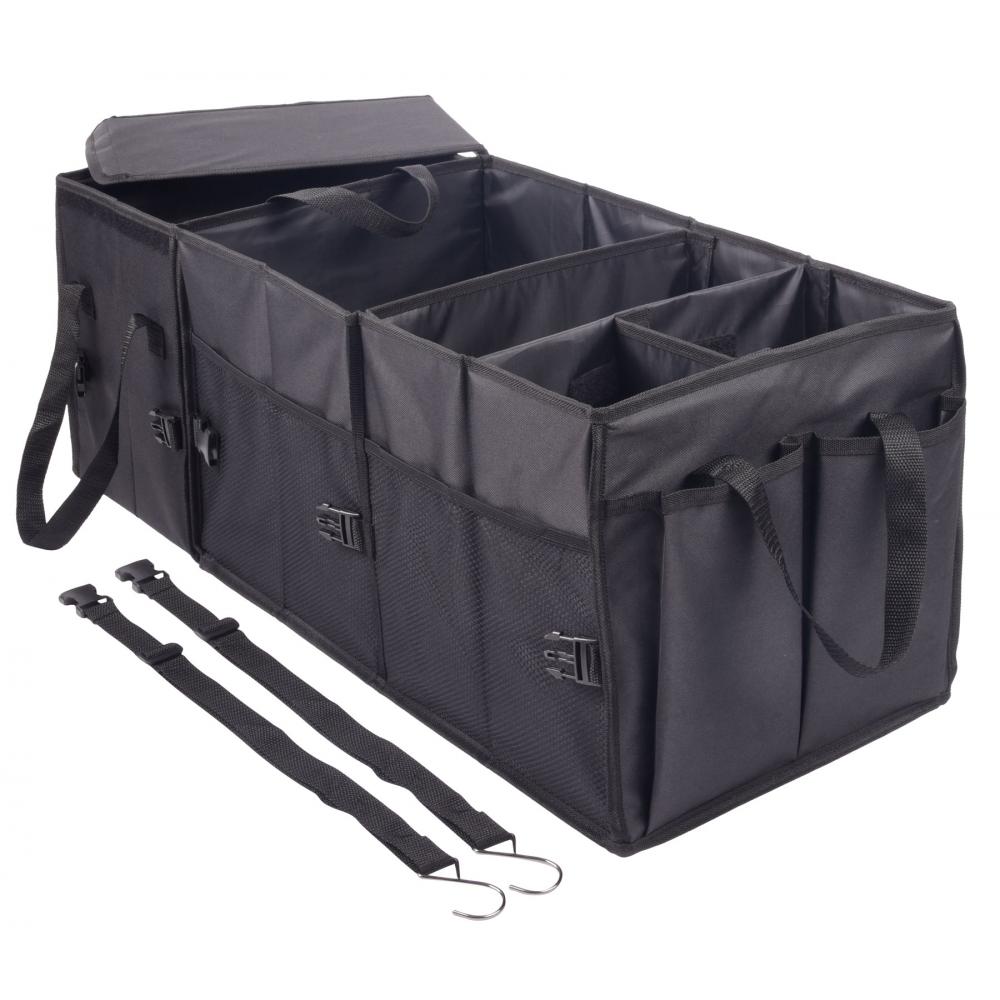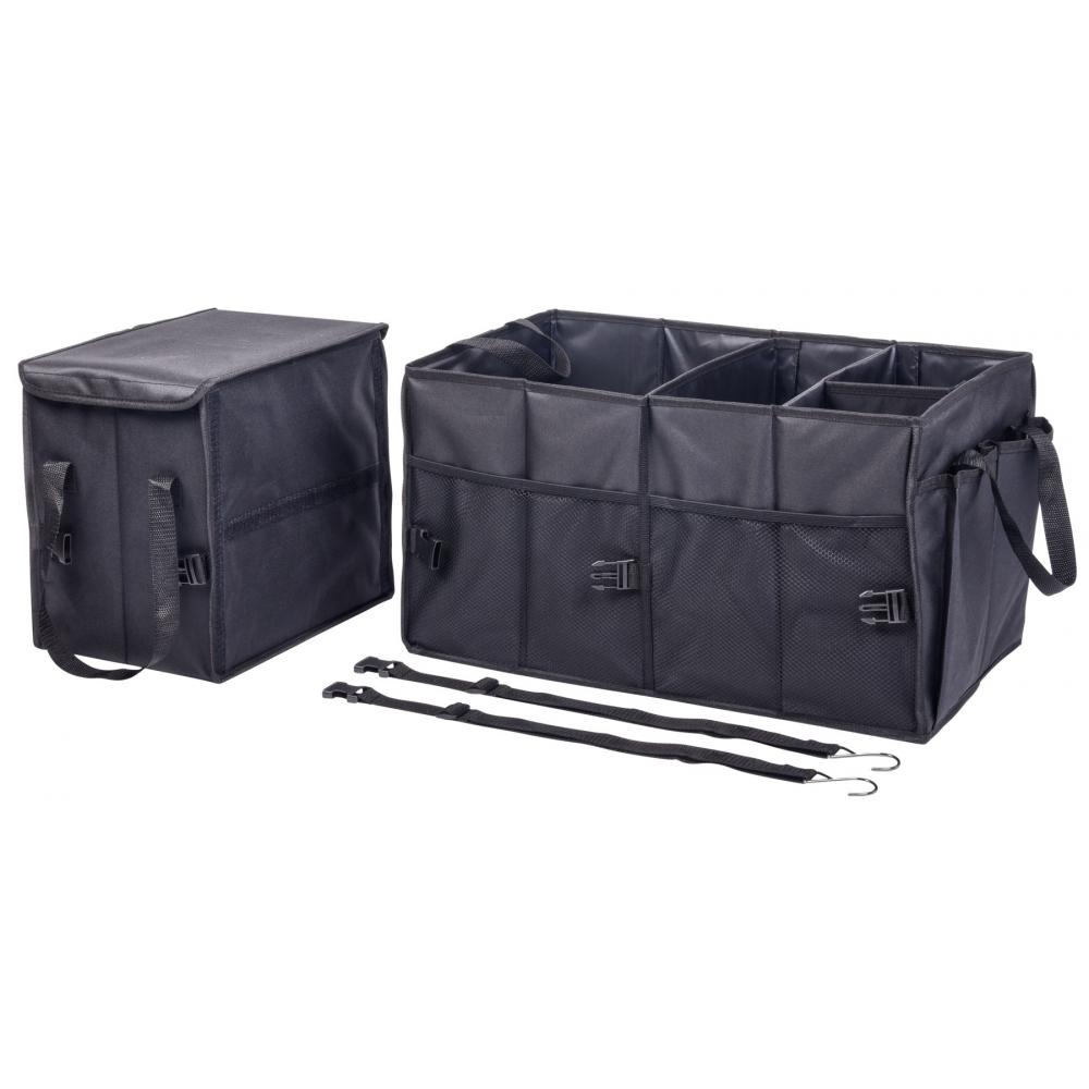 Сумка-органайзер для багажного отделения SUPER GADGET: складная, состоит из 2 сумок, которые можно комбинировать с помощью сенсорных застежек, 1 сумки с крышкой и ручками для переноски, 1 большой сумки с 3 гибкими перегородками, ручками для переноски, 2 накладных кармана сбоку, и сетчатые передние карманы, усиленная основа, 2 ремня и множество зажимов, ремни на липучке внизу для надежного удержания в автомобиле