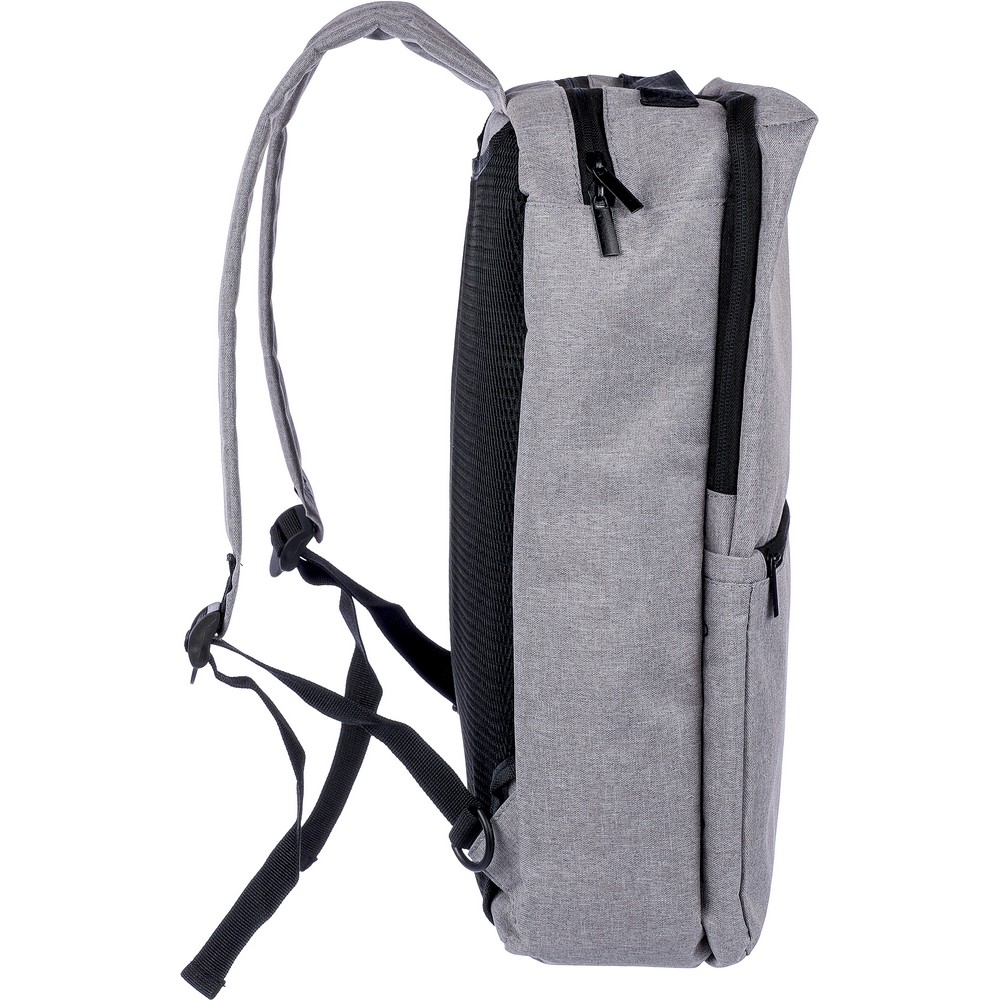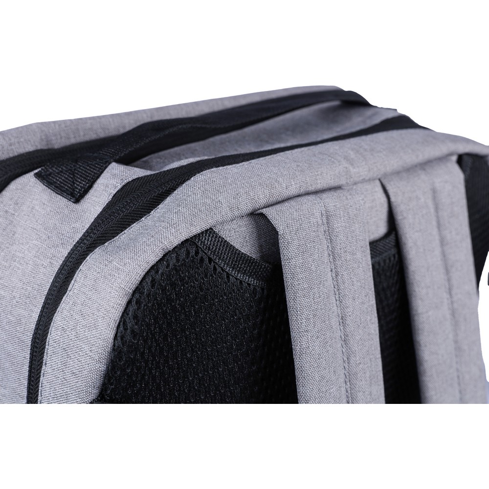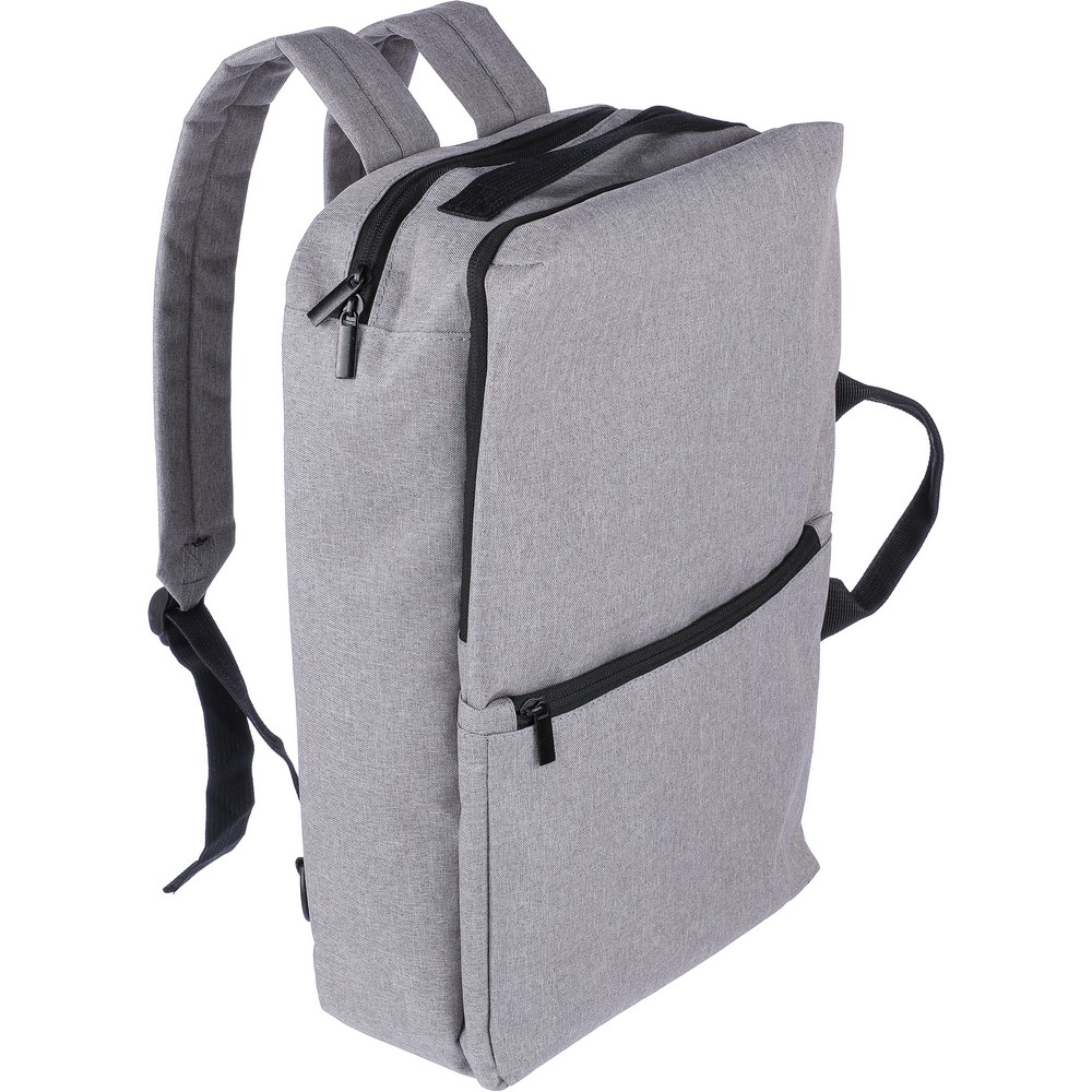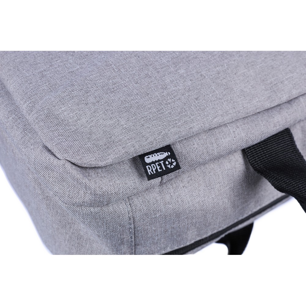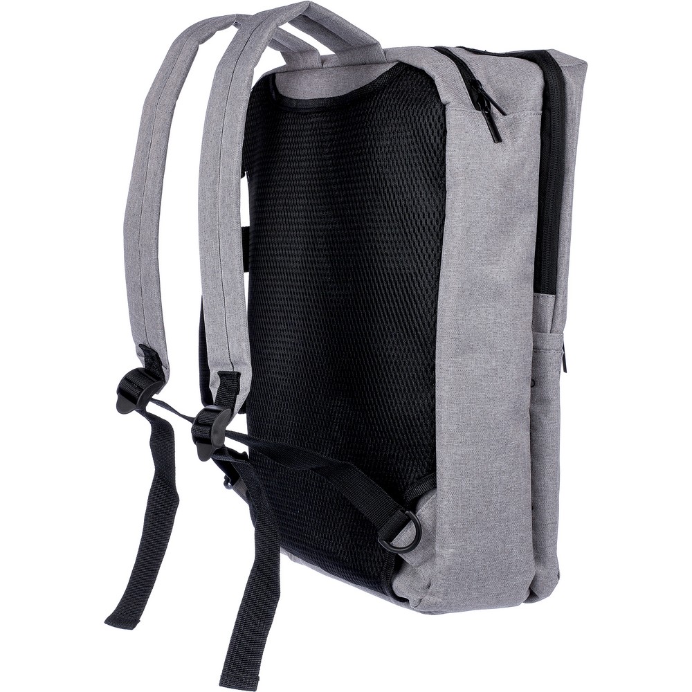 Рюкзак для ноутбука 15" с подкладкой внутри, вместимость рюкзака - 1 л, оснащен ручкой для ношения в руке и двумя боковыми ручками, два больших отделения с молнией, включая одно с отделением для ноутбука 15" с застежкой на липучке, небольшой передний карман на молнии, внутри есть отдельный регулируемый плечевой ремень для крепления к пластиковым крючкам (всего 4 пластиковых крючка), два регулируемых плечевых ремня скрыты за подкладкой на спинке, что позволяет носить сумку как рюкзак, идеально подходит для путешествий, включает значок RPET на ярлыке, изделия из RPET, полиэстера, сетки и пены.