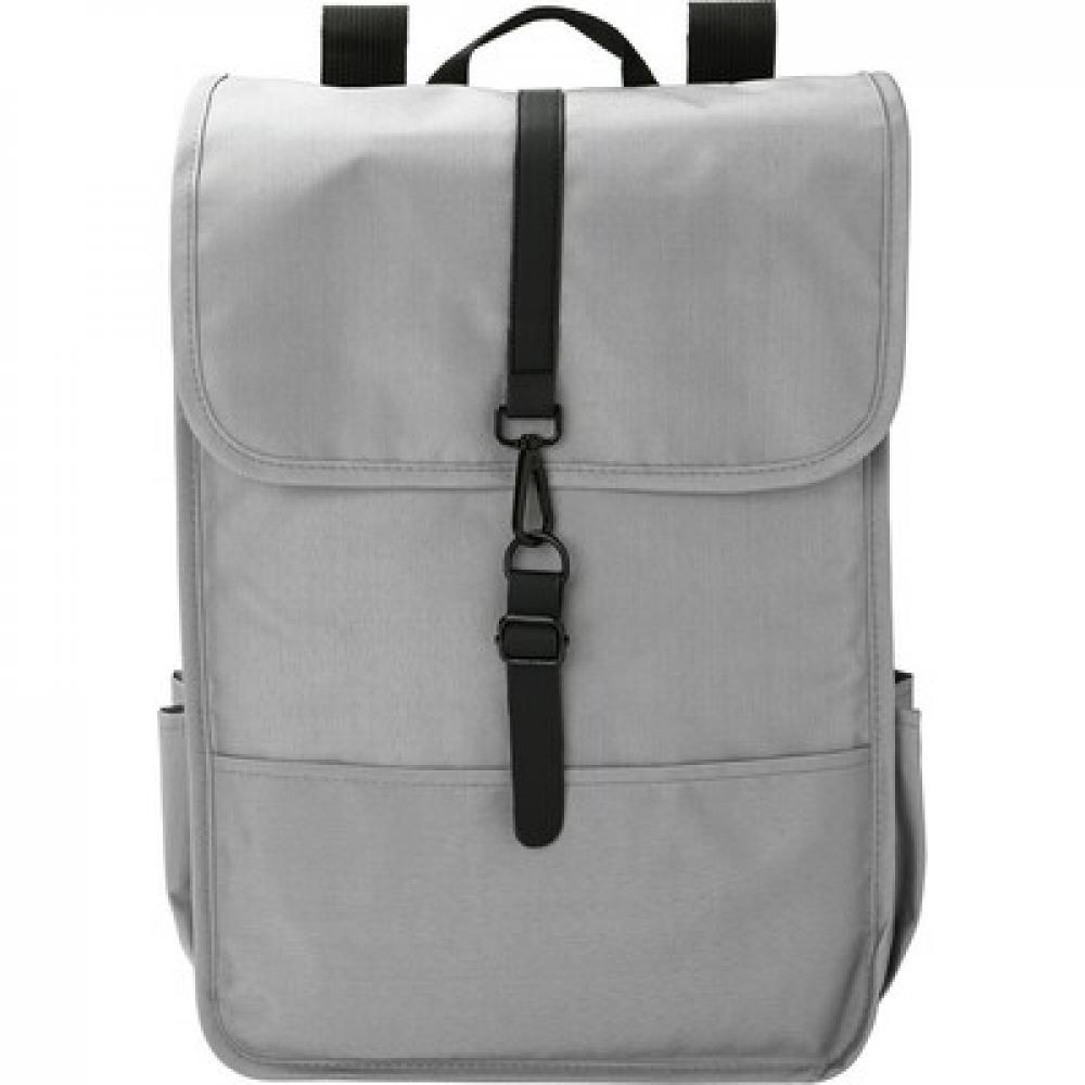 Рюкзак с клапаном, изготовленный из RPET, имеет два боковых кармана, просторное основное отделение, закрывающееся пряжкой.