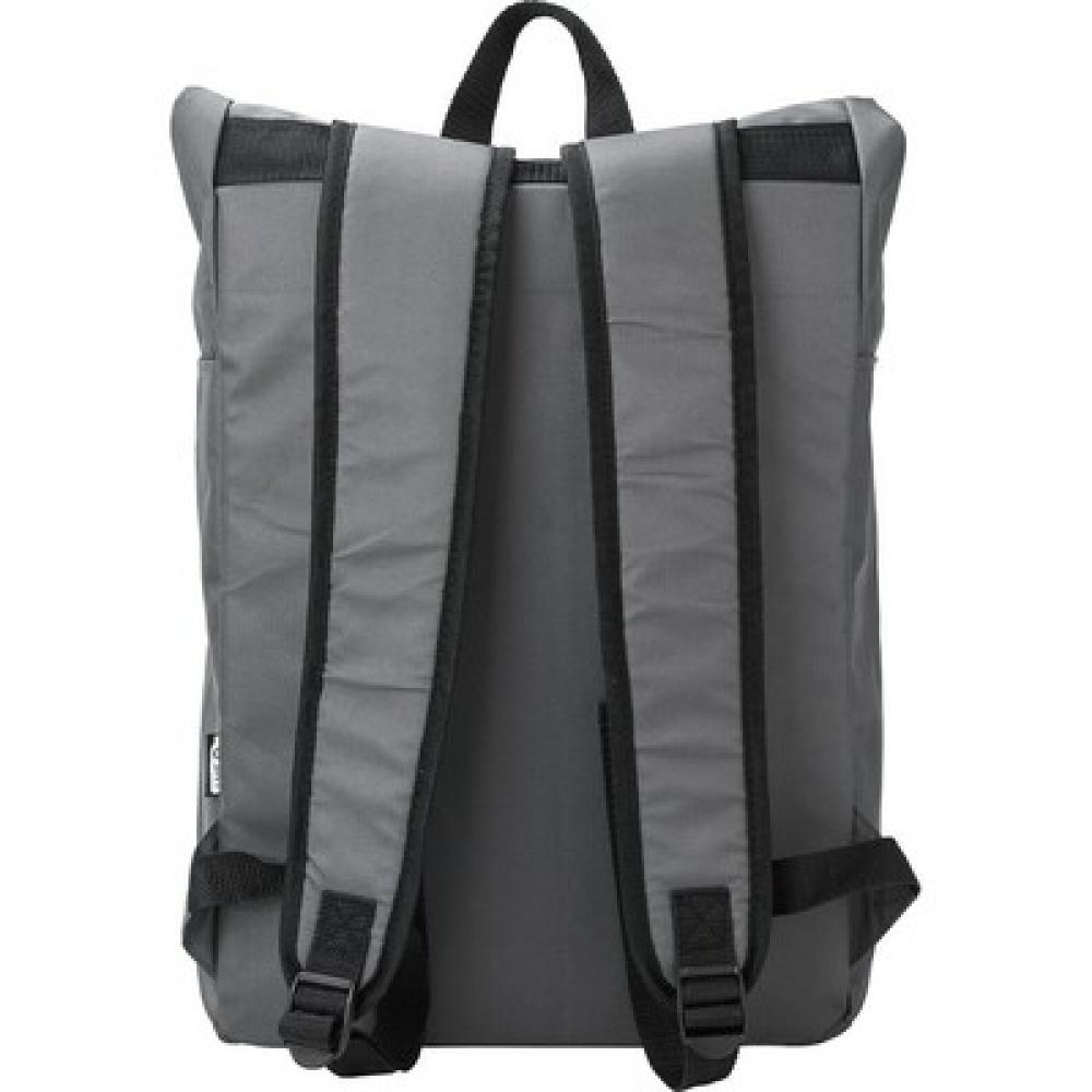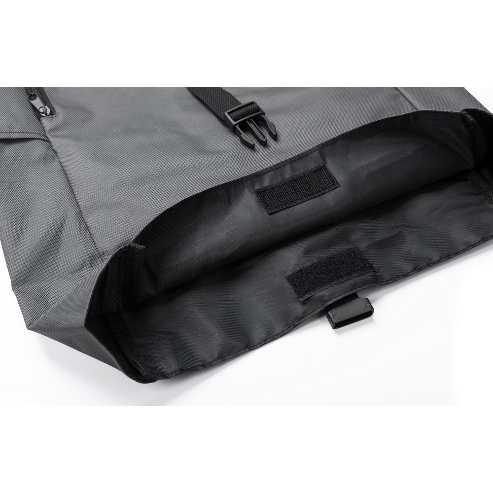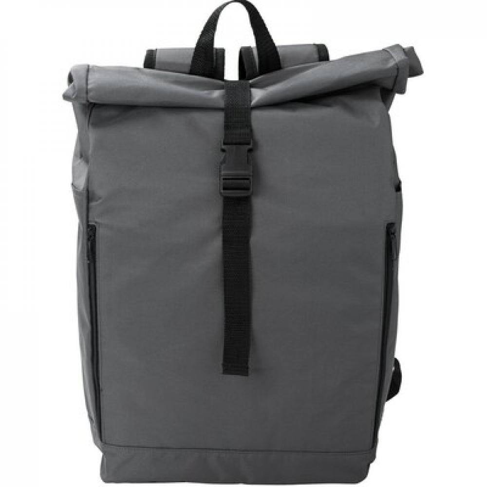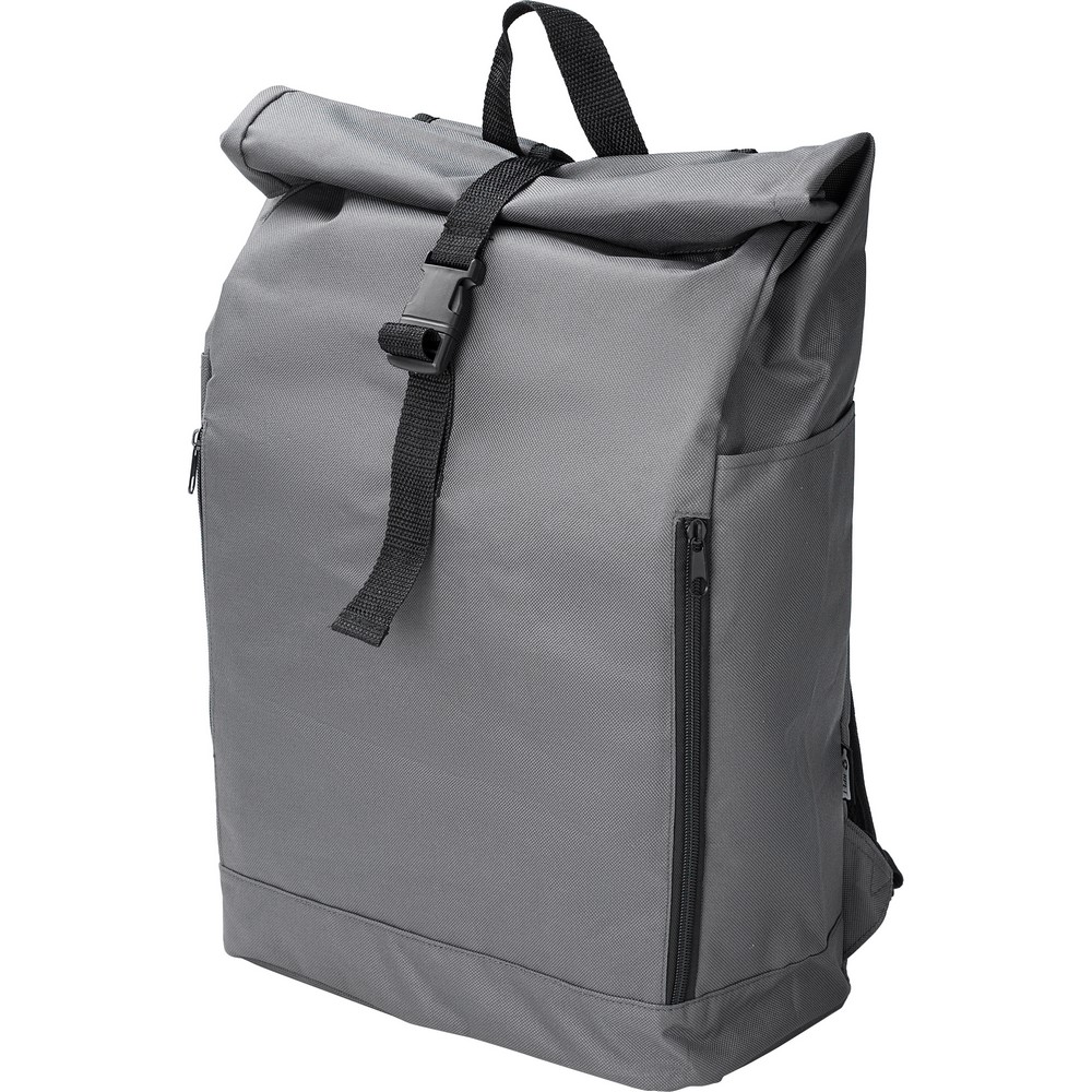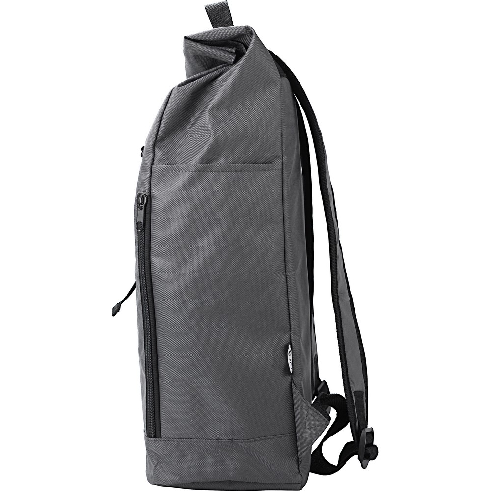 Рюкзак с роллтопом, изготовленный из RPET, имеет два боковых кармана на молнии, просторное основное отделение, закрывается на липучку и застегивается на пряжку.