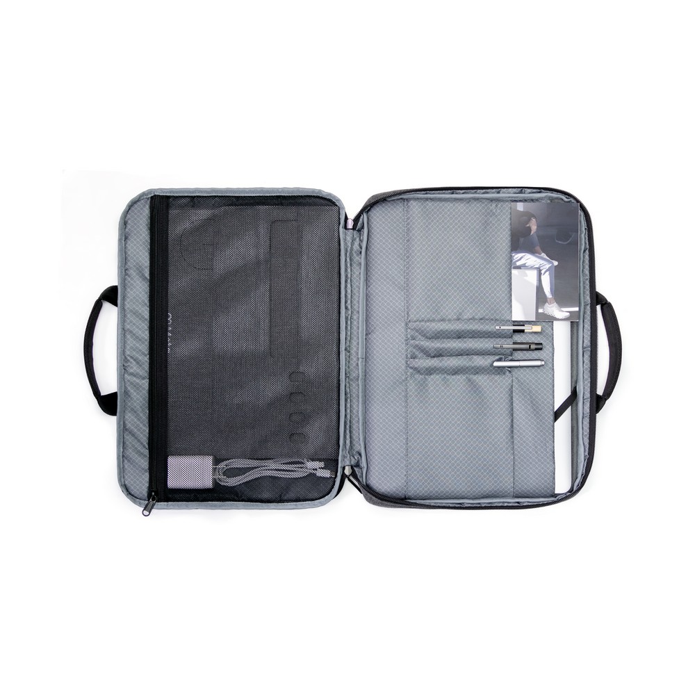 Сумка для ноутбука 16" BrandCharger Specter 2, многофункциональная сумка, 3 режима ношения: в руке, на плече и через плечо (как рюкзак), изготовлена из переработанных пластиковых бутылок PET, просторное основное отделение, подкладка для ноутбука 16", карманы для планшета, телефона, зарядного устройства, кабелей, водонепроницаемый и устойчивый к пятнам материал, разработан для путешествий, работы или повседневного использования, изделие изготовлено из RPET и полиэстера.