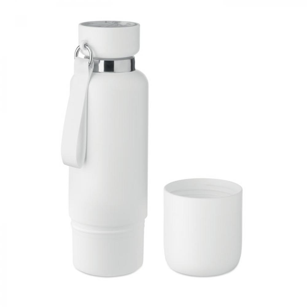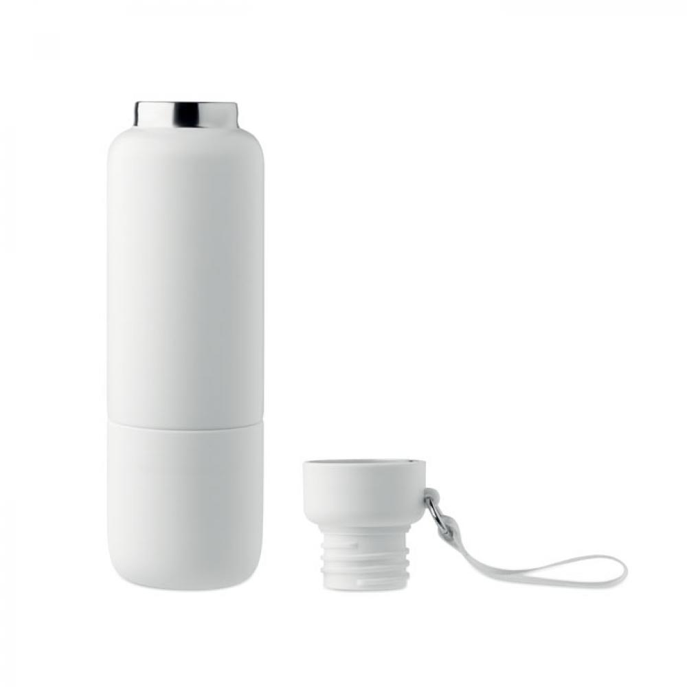 Термобутылка с двойной изоляцией из 90% переработанной нержавеющей стали и 10% нержавеющей стали с ручкой-ремешком и дополнительным длинным ремнем (70 см) в крышке из полипропилена. Герметичная. В комплект входит чашка. Емкость: 500 мл.