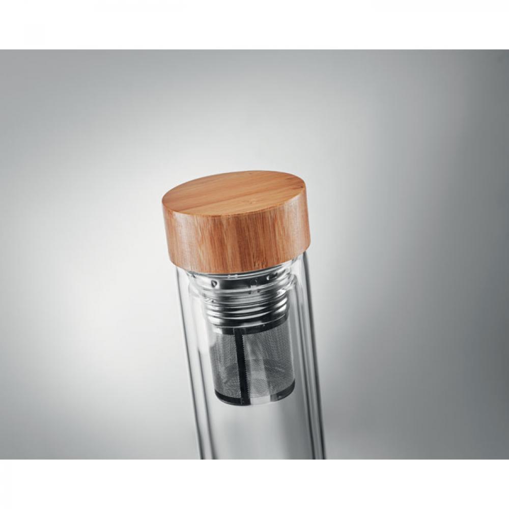 Бутылка из термостойкого стекла с бамбуковой крышкой с чайной сеточкой. Объем 400 мл. Не протекает.