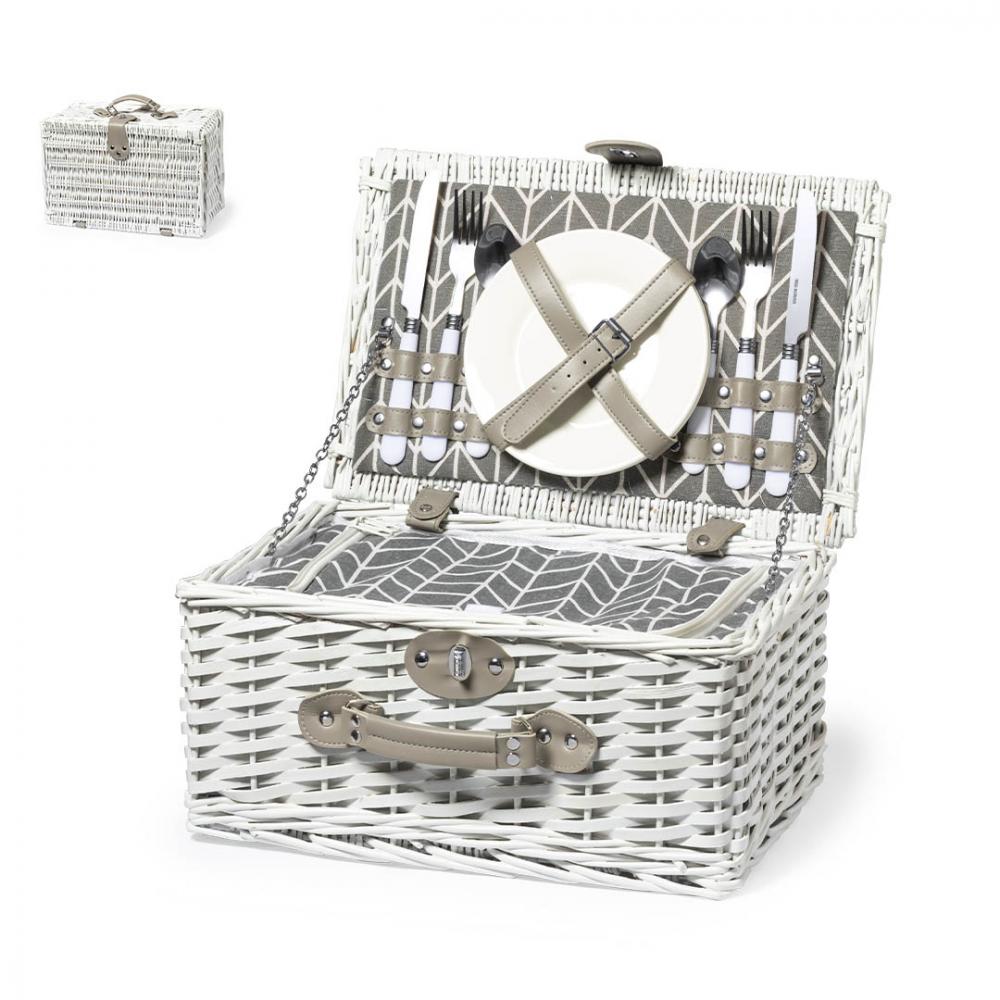 Корзина-холодильник для пикника с белой отделкой, серыми ручками и регулируемыми ремнями. Идеально подходит для двух человек благодаря двум полным сервисам и множеству аксессуаров. В том числе оригинальная сумка-холодильник смелого дизайна с изотермическим алюминием внутри.