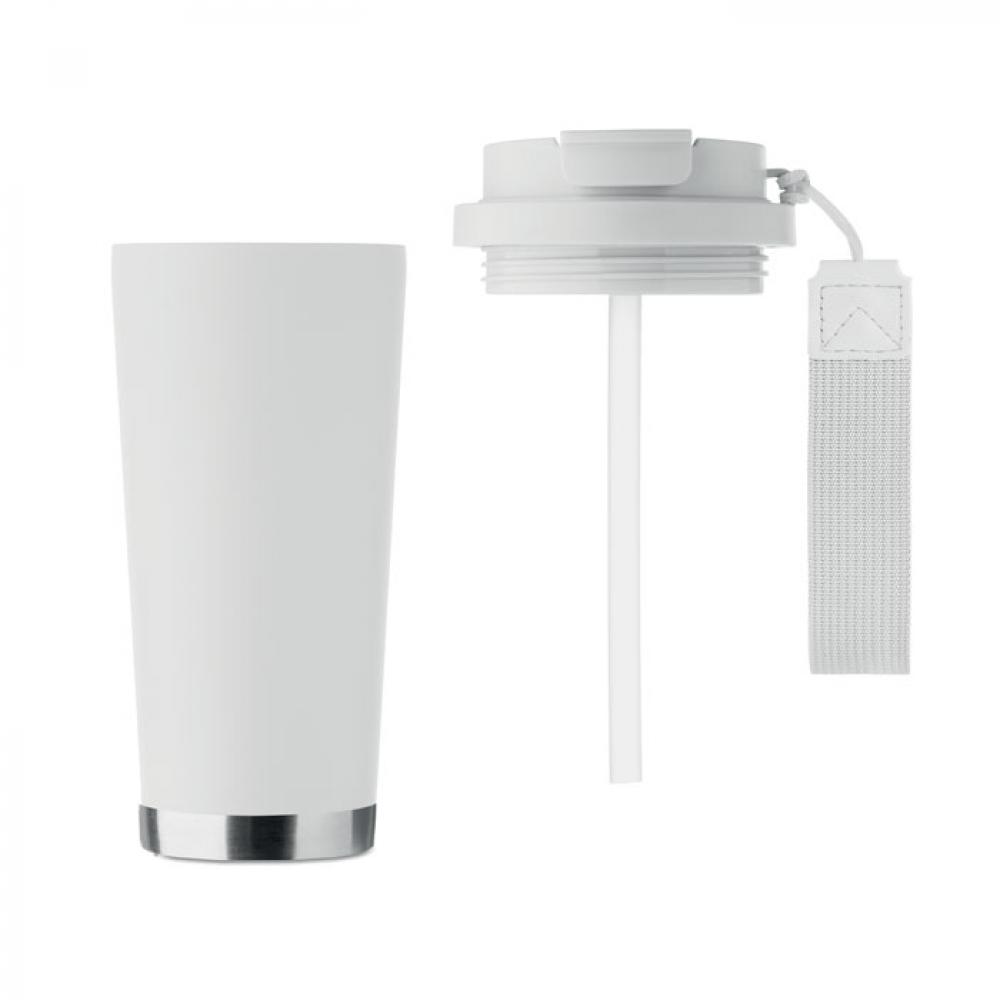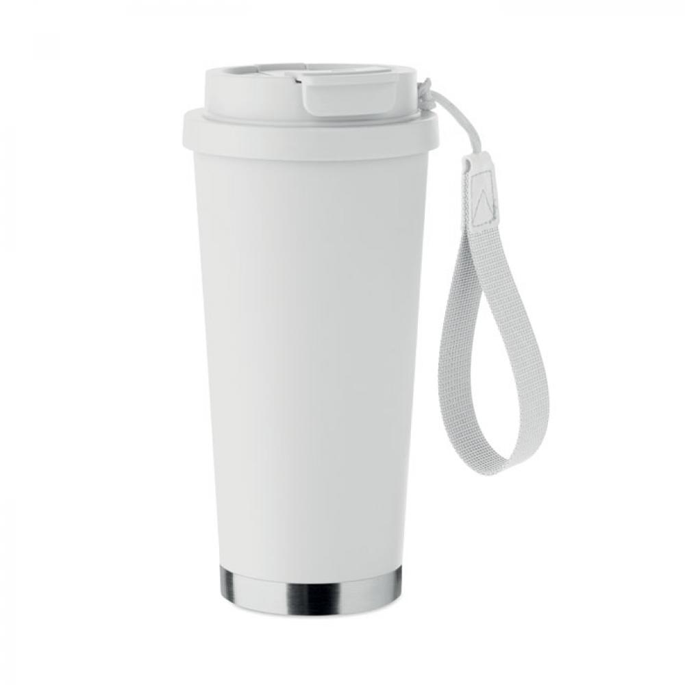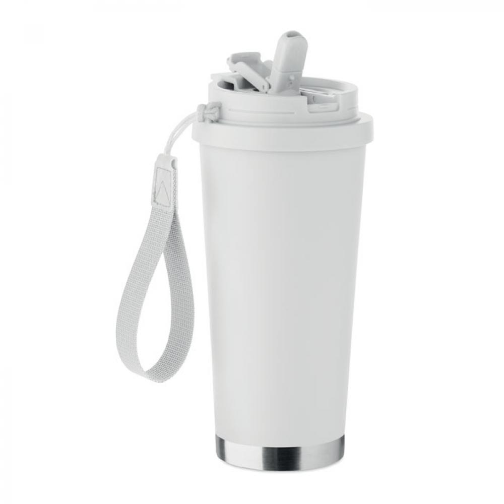 Термокружка с двойными стенками из 90% переработанной нержавеющей стали и 10% нержавеющей стали с пластиковой крышкой, трубочкой для питья и ремнем для переноски. Герметичный. Емкость: 500 мл.