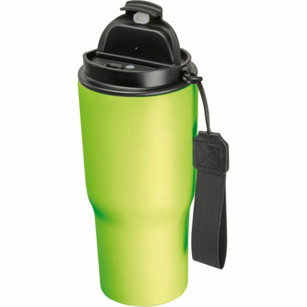 Элегантная двухслойная вакуумная кружка из нержавеющей стали объемом 550 мл с герметичной завинчивающейся крышкой и отверстием для питья, а также с удобным ремешком для переноски.