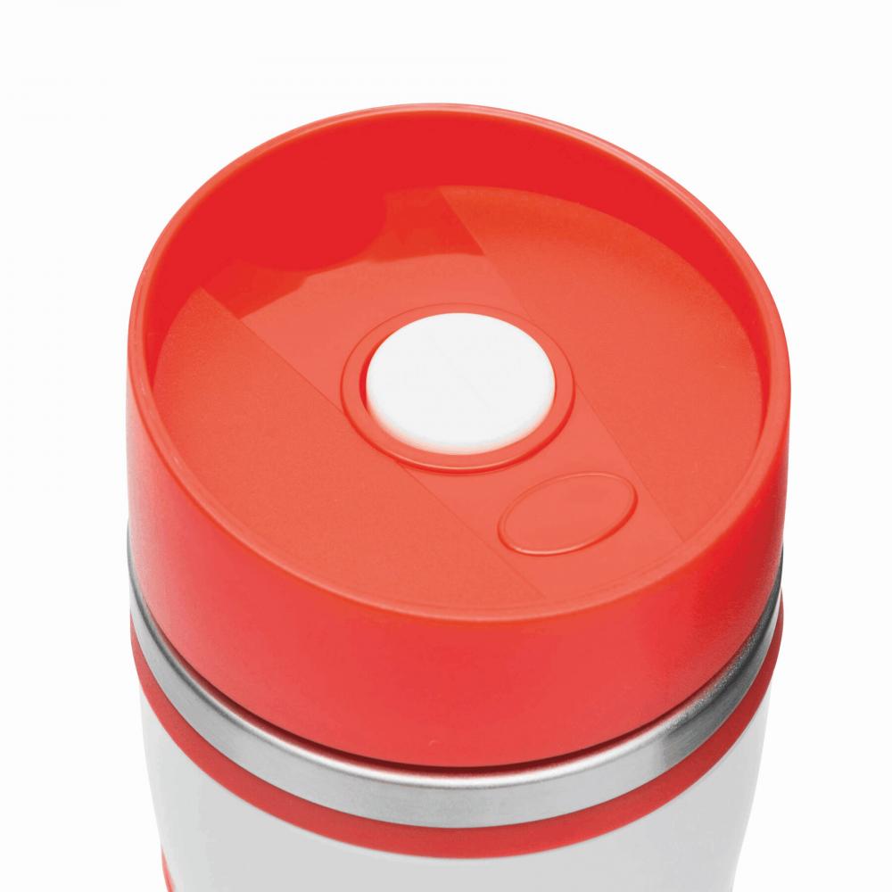 Дорожная кружка ARABICA с двойными стенками из нержавеющей стали внутри и снаружи, пластиковая крышка контрастного цвета с надежно завинчивающейся крышкой, кнопка ОТКРЫТЬ / ЗАКРЫТЬ и встроенное отверстие для питья, цветная резиновая втулка для лучшего захвата и прорезиненная подставка для хорошей поверхности адгезия, ок. Емкость 400 мл